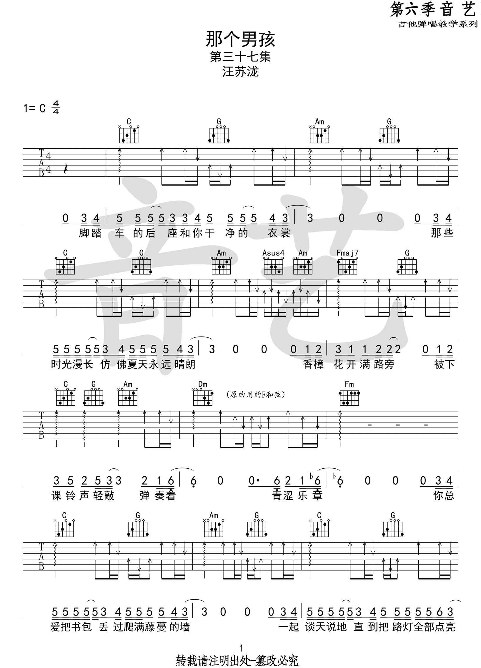 《汪苏泷《那个男孩吉他谱》(G调)》内容来自于互联网,不能保证内容的准确性与完整性,仅供学习交流欣赏,请勿用于其它用途,内容版权归原作者及来源网站所有,如有侵犯到您的权益请来信告知,我们将及时删除。