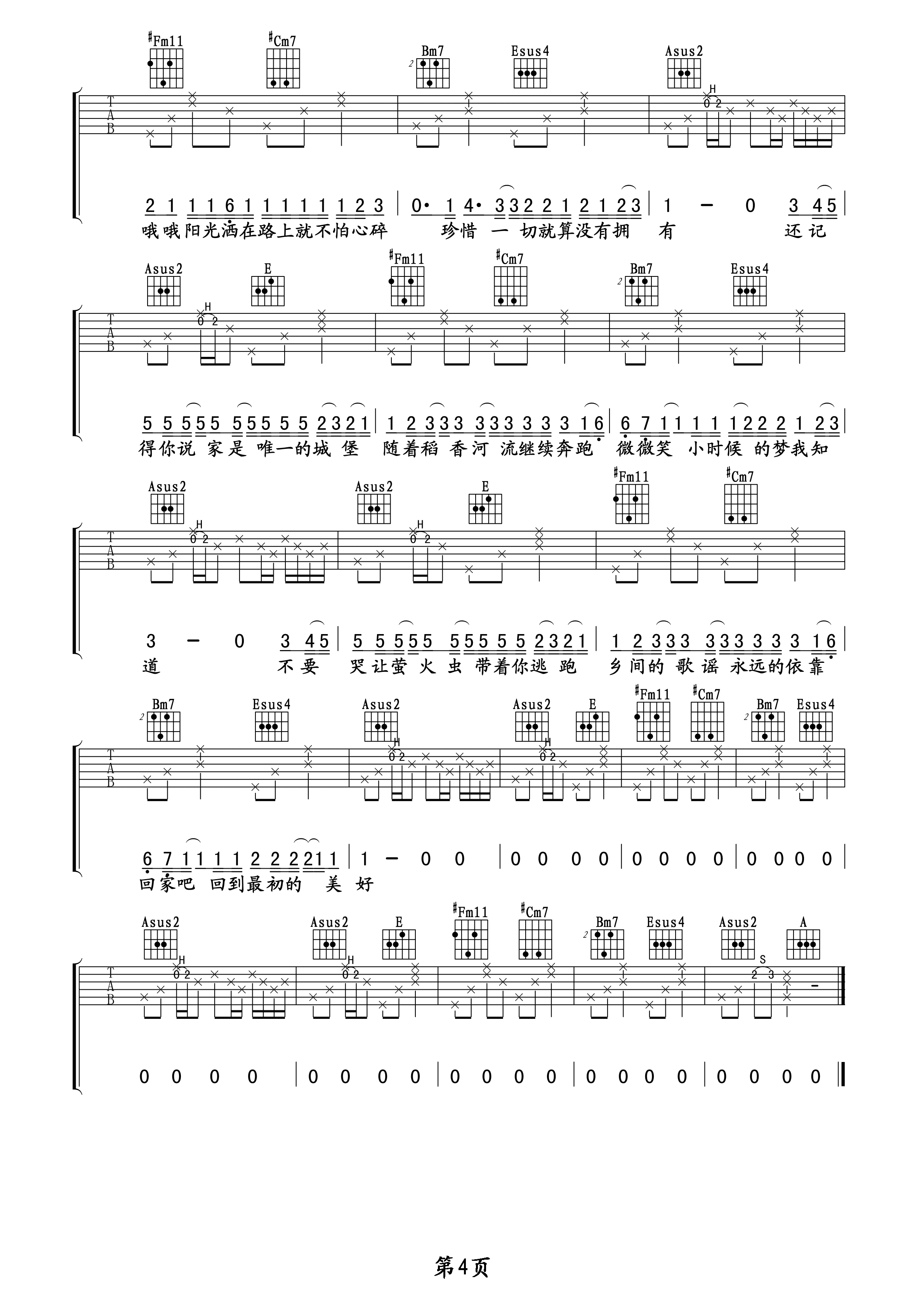 《四块五》以D调和弦为基调,变调夹夹二品,旋律质朴深情。歌曲表达了对平凡生活中真挚情感的珍视与怀念,以“四块五”象征纯粹而朴素的爱情。弹奏时需注重指法的连贯与节奏的稳定,主歌部分采用分解和弦突出抒情性,副歌通过扫弦增强情感张力。整曲简洁流畅,和弦变化自然,适合