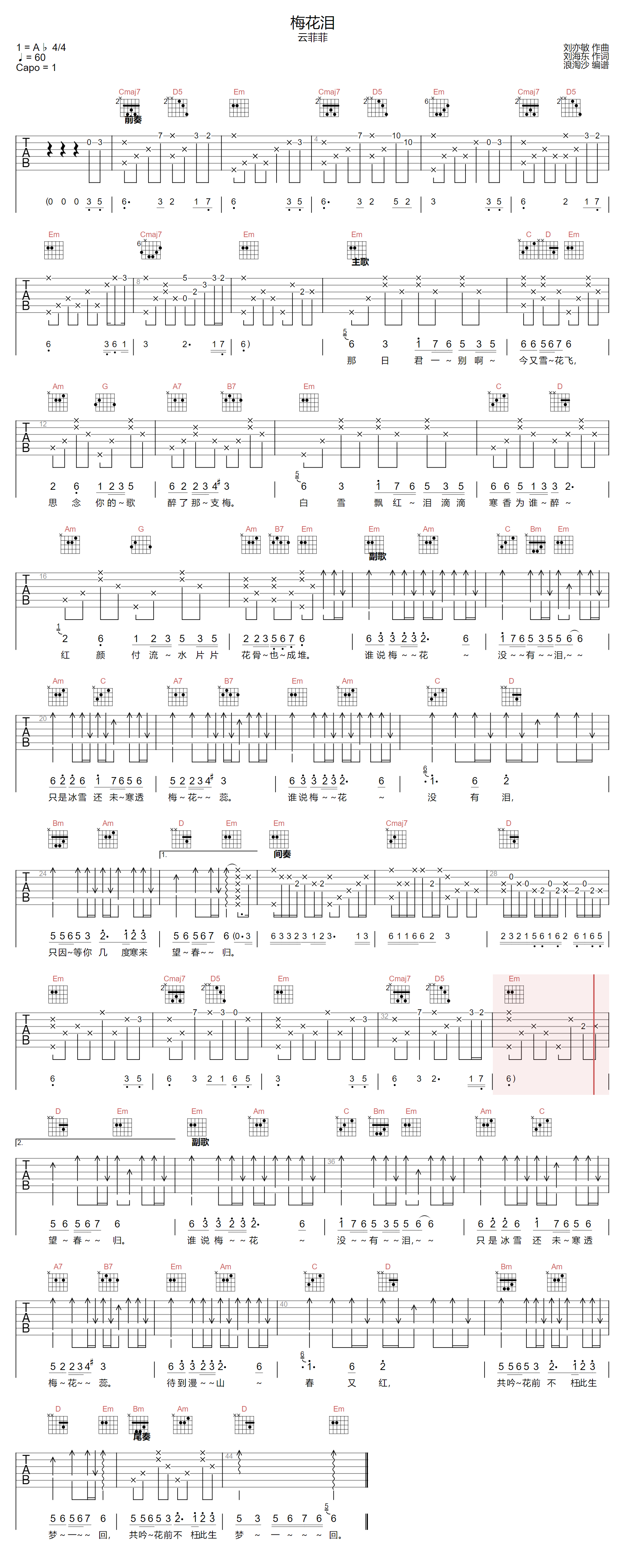 云菲菲《梅花泪吉他谱》(G调)
