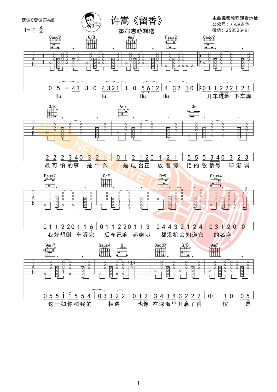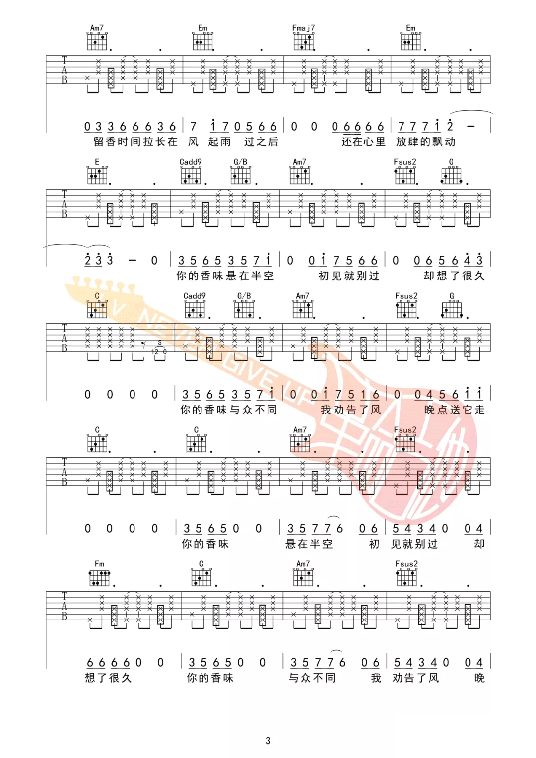 《许嵩《留香吉他谱》(G调)》内容来自于互联网,不能保证内容的准确性与完整性,仅供学习交流欣赏,请勿用于其它用途,内容版权归原作者及来源网站所有,如有侵犯到您的权益请来信告知,我们将及时删除。