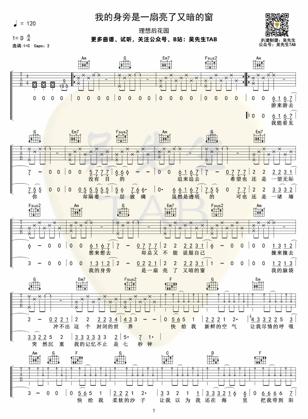《我的身旁是一扇亮了又暗的窗》由理想后花园乐队演唱,以C调谱写。歌曲旋律平静甜美,却蕴含深沉力量,表达了对生活与梦想的坚持与感悟。弹奏上注重轻柔的分解和弦与细腻的指法,营造出温暖而富有层次的氛围。其特点是情感真挚、节奏舒缓,适合用吉他或钢琴演绎。这首歌与《我的