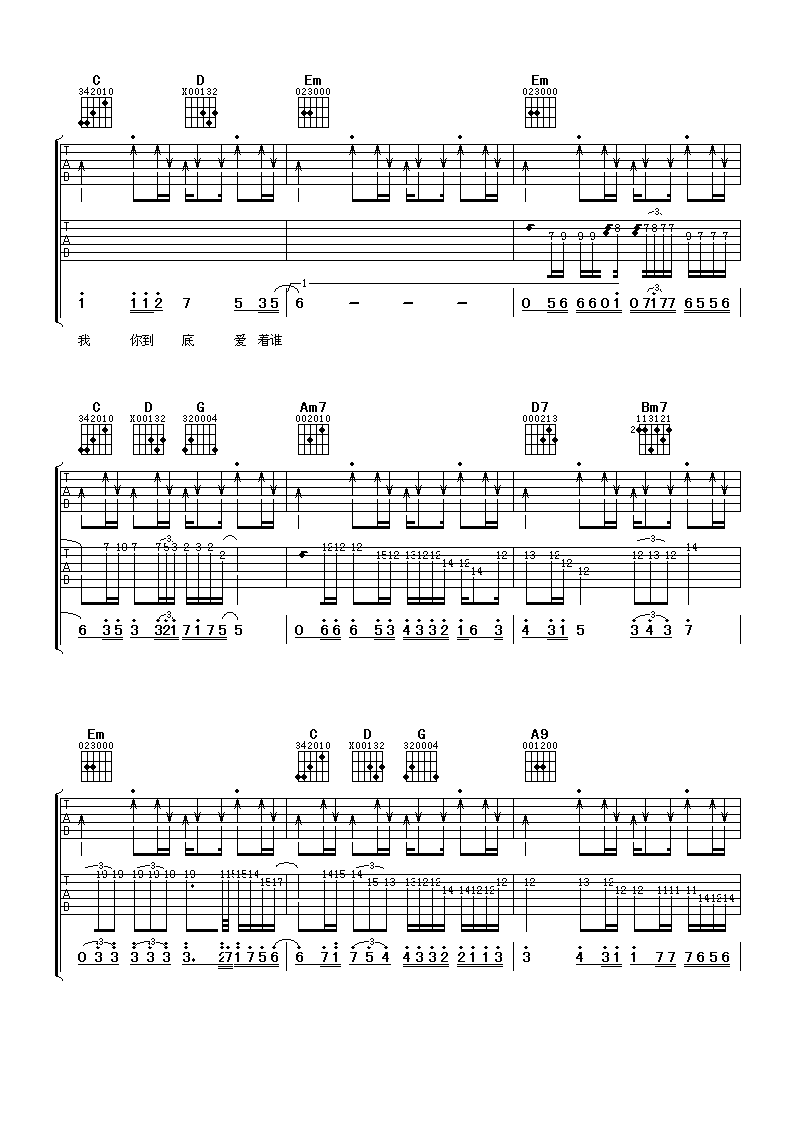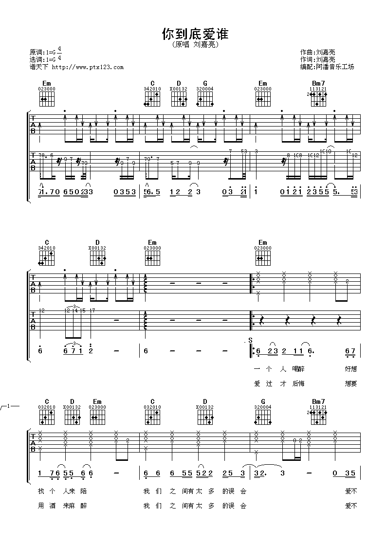 《刘嘉亮《你到底爱谁吉他谱》(G调)》内容来自于互联网,不能保证内容的准确性与完整性,仅供学习交流欣赏,请勿用于其它用途,内容版权归原作者及来源网站所有,如有侵犯到您的权益请来信告知,我们将及时删除。