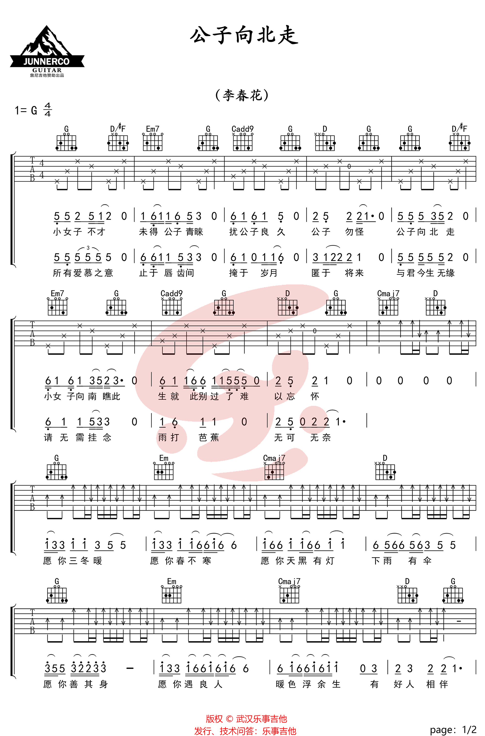 《李春花《公子向北走吉他谱》(C调)》内容来自于互联网,不能保证内容的准确性与完整性,仅供学习交流欣赏,请勿用于其它用途,内容版权归原作者及来源网站所有,如有侵犯到您的权益请来信告知,我们将及时删除。