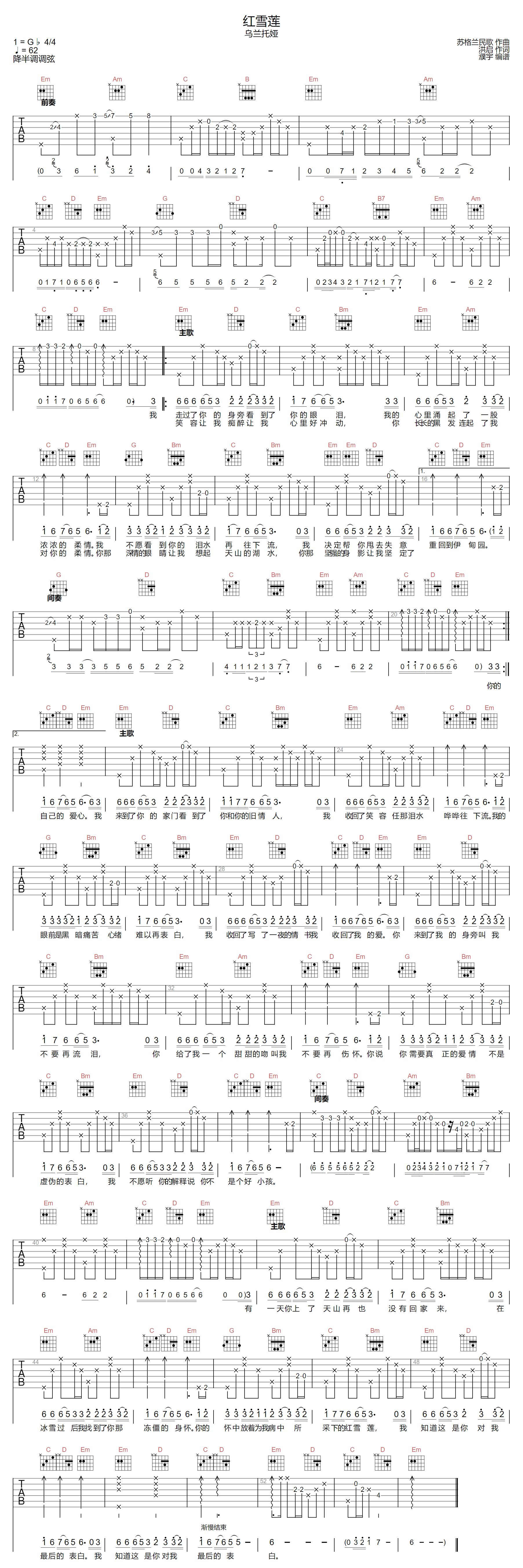 《乌兰托娅《红雪莲吉他谱》(G调)》内容来自于互联网,不能保证内容的准确性与完整性,仅供学习交流欣赏,请勿用于其它用途,内容版权归原作者及来源网站所有,如有侵犯到您的权益请来信告知,我们将及时删除。