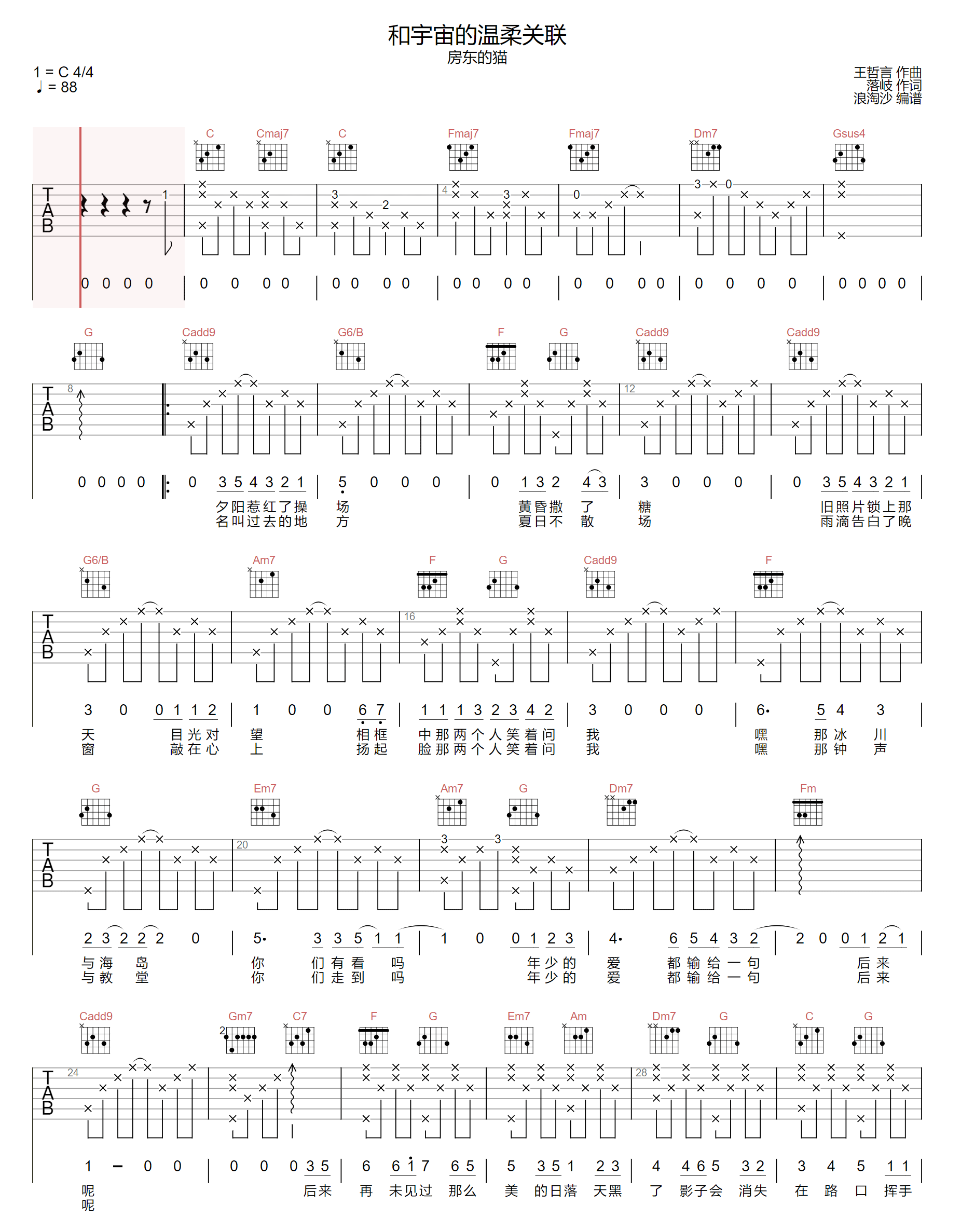 房东的猫《和宇宙的温柔关联吉他谱》(E调)
