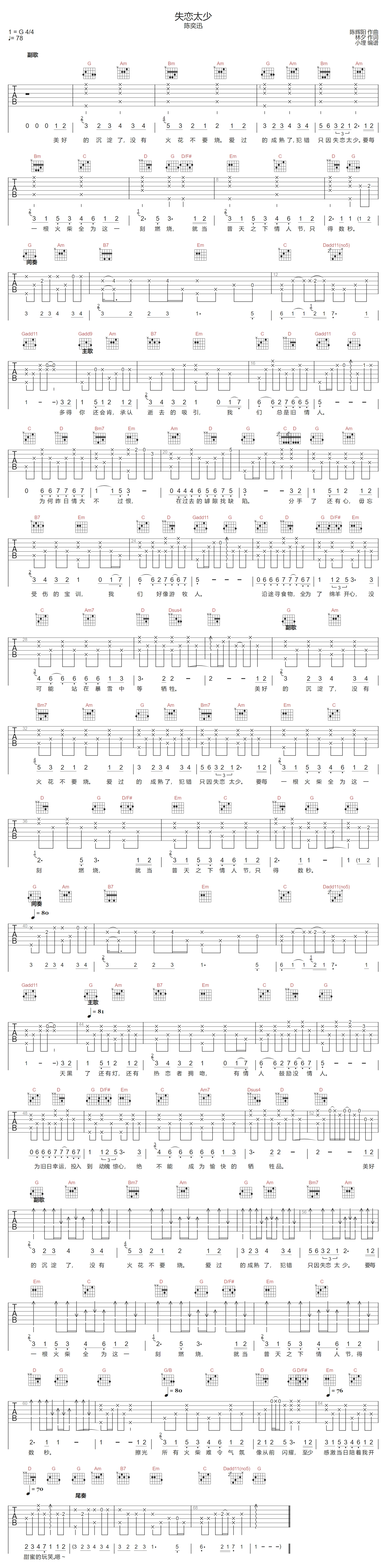 《陈奕迅《失恋太少吉他谱》(C调)》内容来自于互联网,不能保证内容的准确性与完整性,仅供学习交流欣赏,请勿用于其它用途,内容版权归原作者及来源网站所有,如有侵犯到您的权益请来信告知,我们将及时删除。