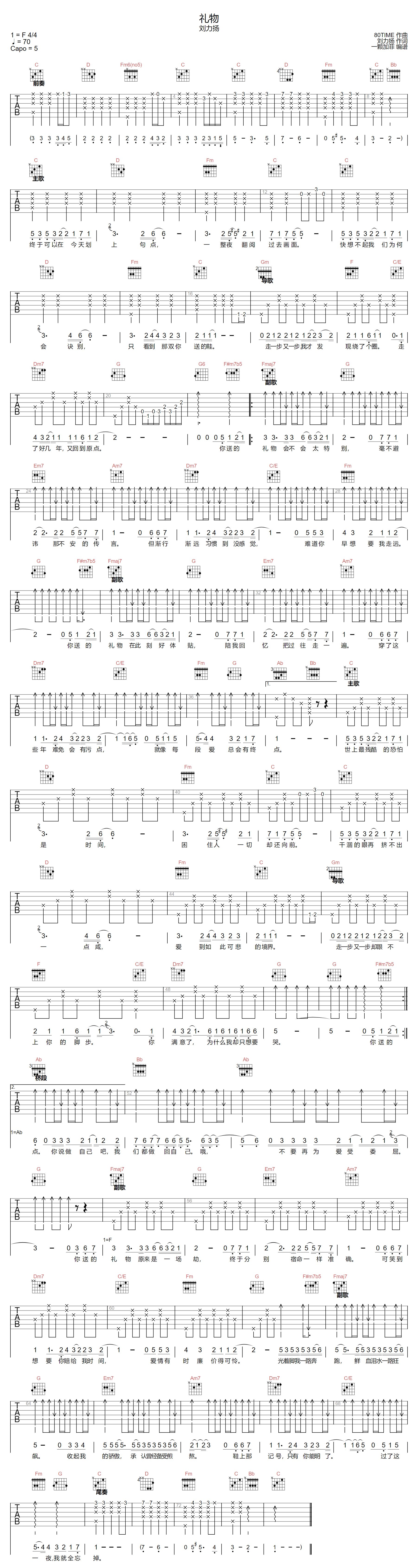 《刘力扬《礼物吉他谱》(C调)》内容来自于互联网,不能保证内容的准确性与完整性,仅供学习交流欣赏,请勿用于其它用途,内容版权归原作者及来源网站所有,如有侵犯到您的权益请来信告知,我们将及时删除。