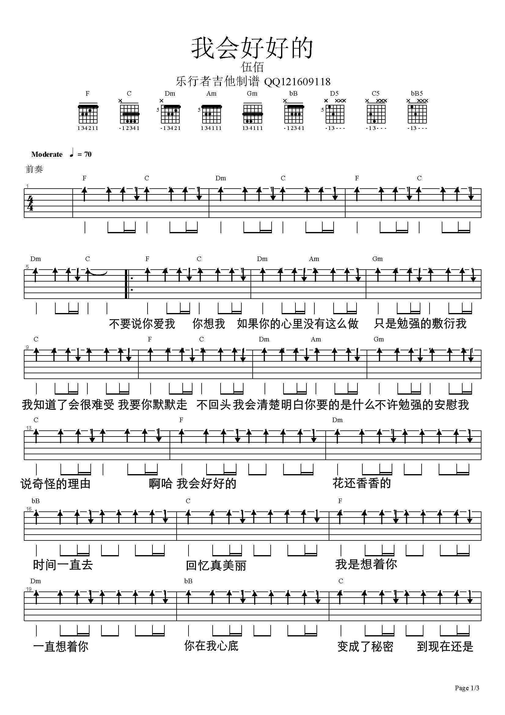 我会好好的伍佰演唱C调,经典老歌。我会好的,高清弹唱图片谱,上传推荐。一首非常适合吉他弹唱的歌曲,柔和平静的旋律,走心的歌词,唱出了许多人的心声,动听的歌声打动了无数人,愿我们在歌声里有不一样的青春,成为对方生命中最重要的主角。民谣有三:姑娘,吉他,南北方。听