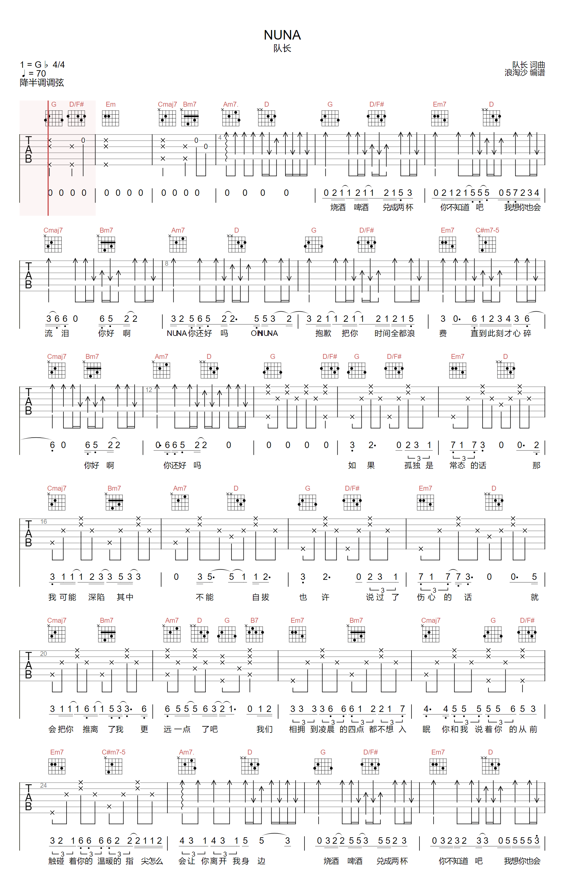 《队长《NUNA吉他谱》(G调)》内容来自于互联网,不能保证内容的准确性与完整性,仅供学习交流欣赏,请勿用于其它用途,内容版权归原作者及来源网站所有,如有侵犯到您的权益请来信告知,我们将及时删除。