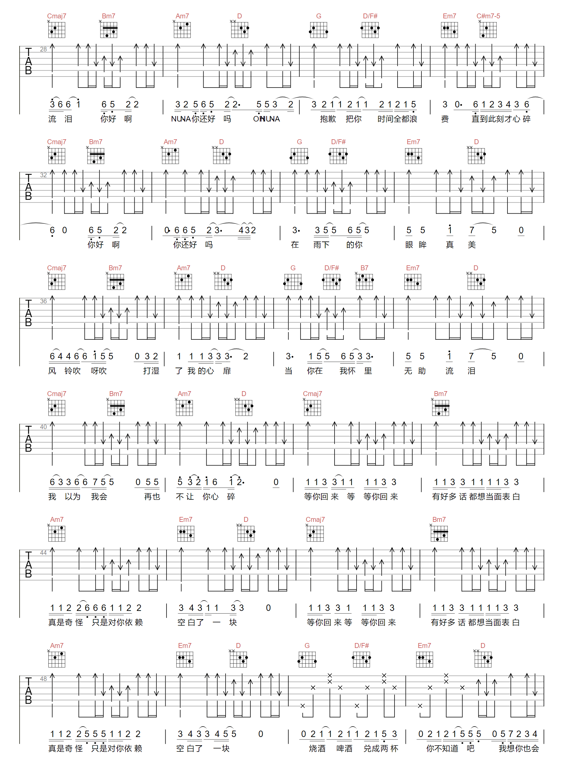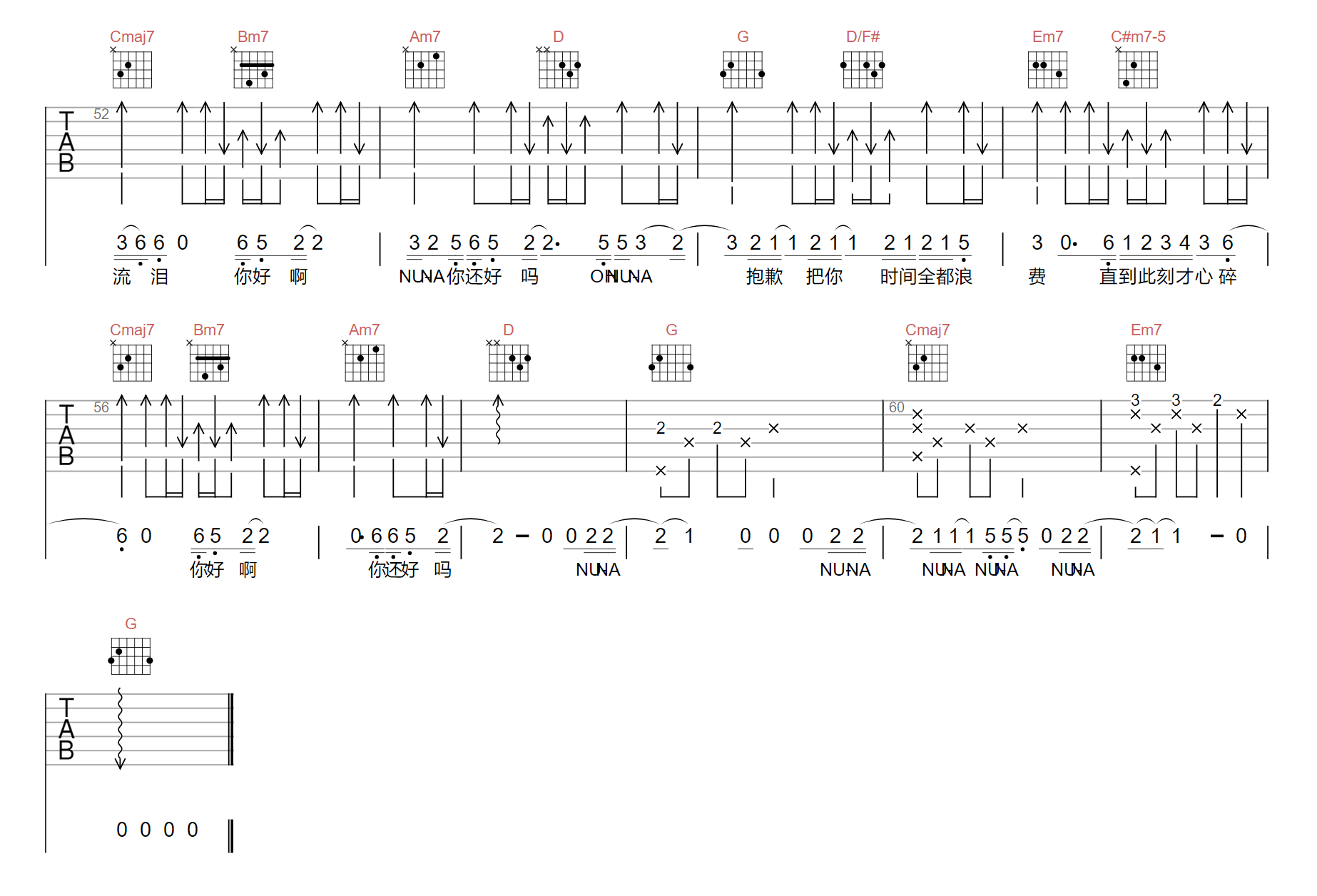 NUNA队长演唱G调,吉他弹唱谱,三张高清图片,感谢梦马音乐的编配和提供的弹唱演示视频,推荐分享。这首歌基本都是一个切音的节奏型。只要掌握这个简单的节奏型,你就学会了一大半。一些简单的节奏型,对于新手来说可能稍微难一点,但的节奏型,加油吧。吉他弹唱示范视频: