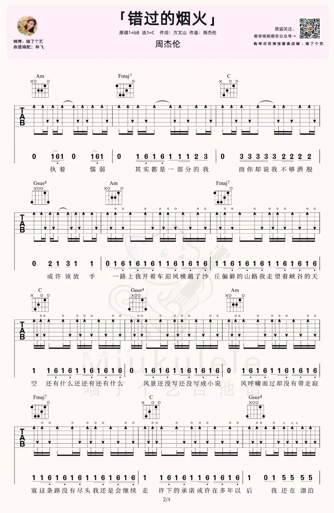 《错过的烟火》由周杰伦演唱,以G调编曲,变调夹夹一品演奏。歌曲情感真挚,表达了对逝去时光的怀念与遗憾,旋律中充满深情与感伤。弹奏技巧上,节奏型较为简单,适合初学者练习,但和弦变化丰富,需注意指法转换与情感融入。整体风格细腻柔和,突出周杰伦独特的音乐韵味。吉他弹