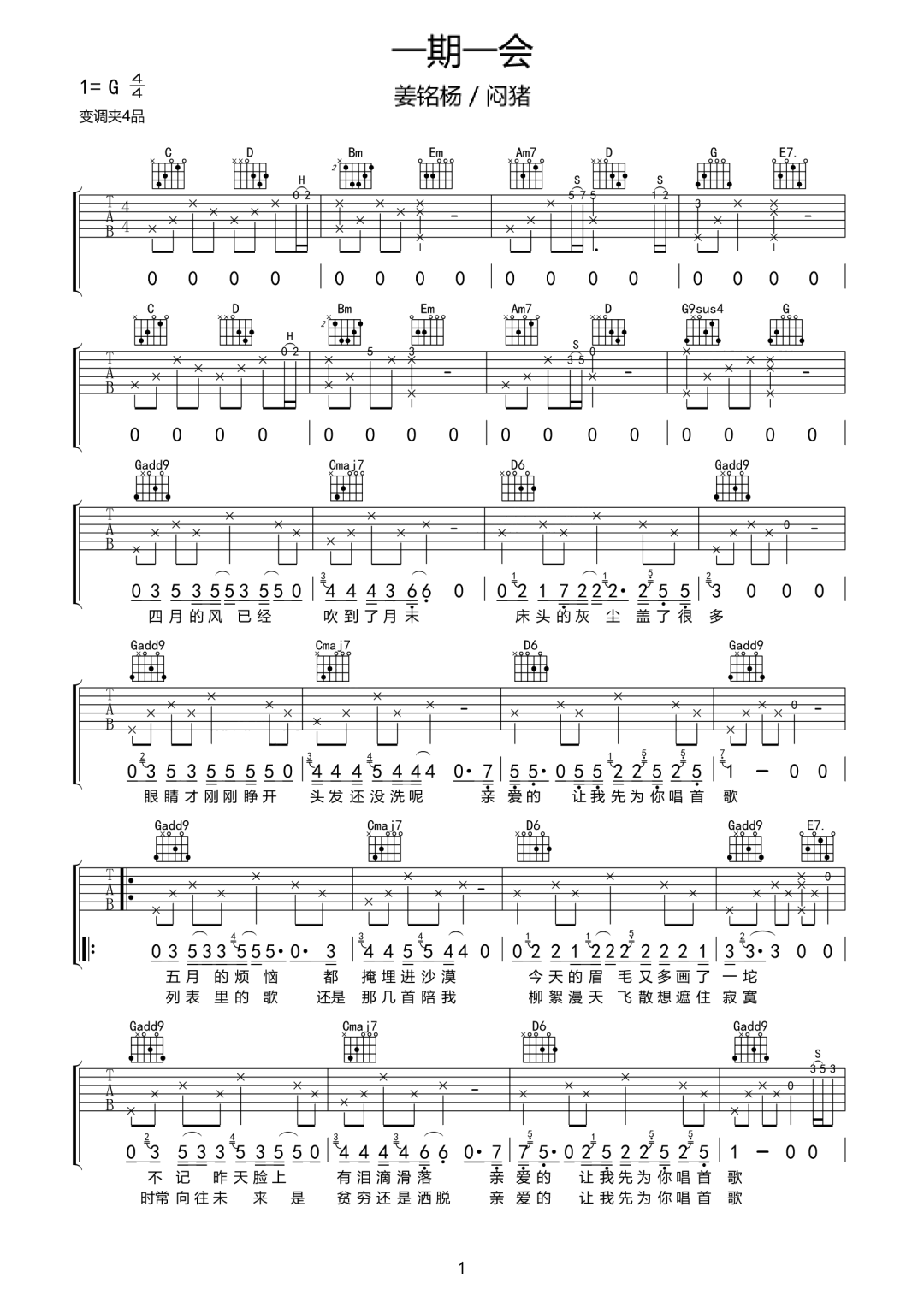 《姜铭杨/闷猪《一期一会吉他谱》(C调)》内容来自于互联网,不能保证内容的准确性与完整性,仅供学习交流欣赏,请勿用于其它用途,内容版权归原作者及来源网站所有,如有侵犯到您的权益请来信告知,我们将及时删除。