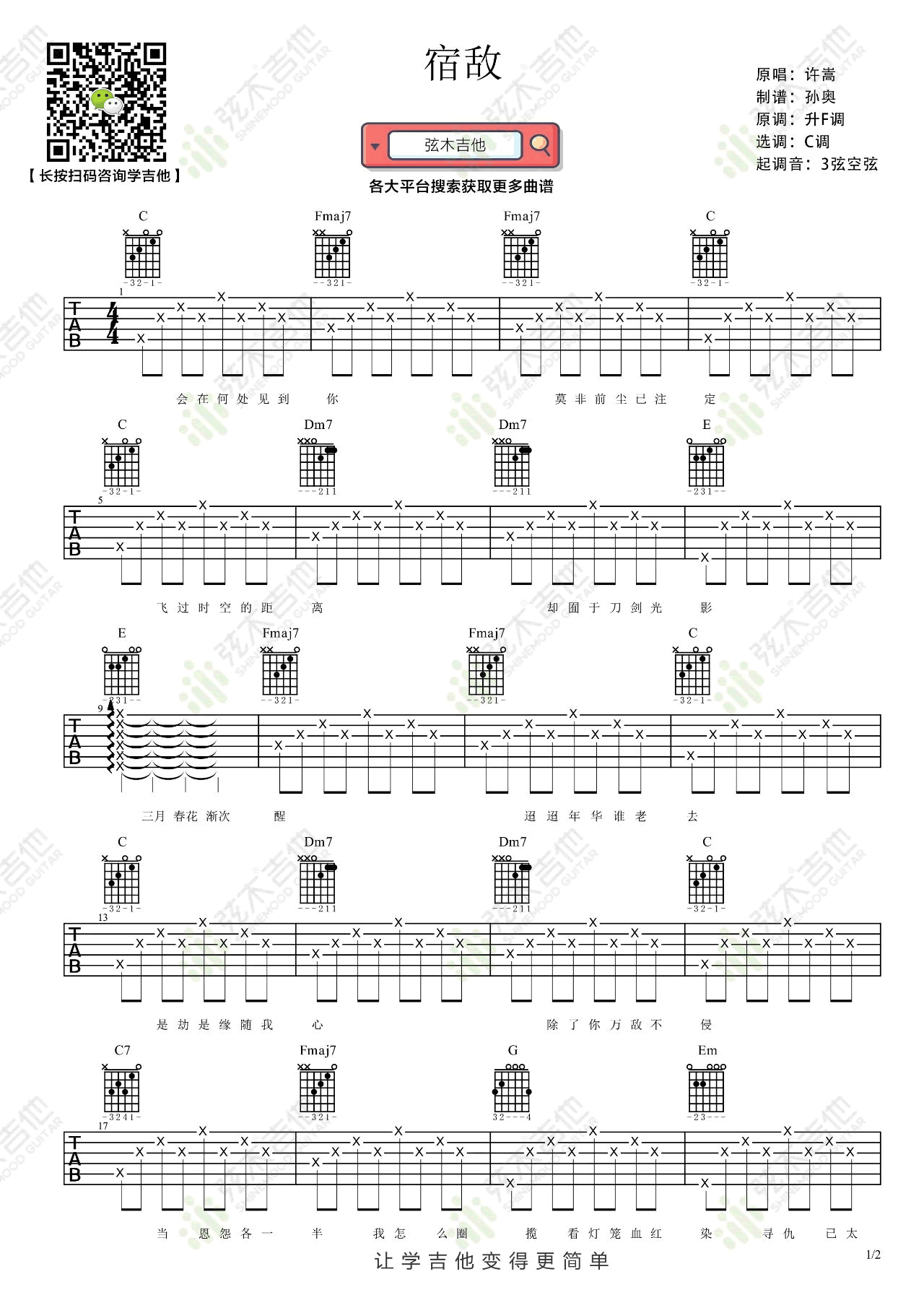 《许嵩《宿敌吉他谱》(C调)》内容来自于互联网,不能保证内容的准确性与完整性,仅供学习交流欣赏,请勿用于其它用途,内容版权归原作者及来源网站所有,如有侵犯到您的权益请来信告知,我们将及时删除。