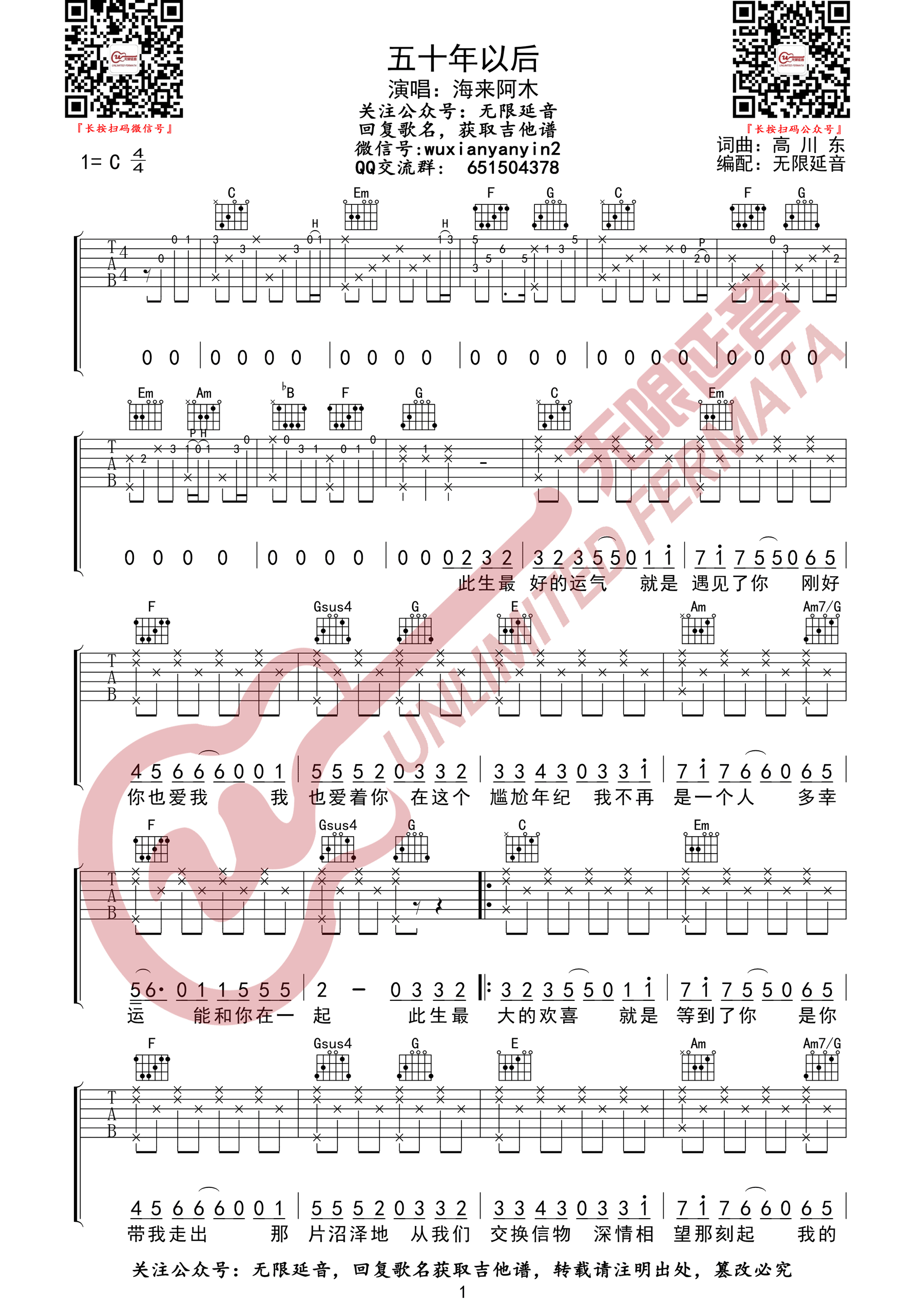 《海来阿木《五十年以后吉他谱》(G调)》内容来自于互联网,不能保证内容的准确性与完整性,仅供学习交流欣赏,请勿用于其它用途,内容版权归原作者及来源网站所有,如有侵犯到您的权益请来信告知,我们将及时删除。