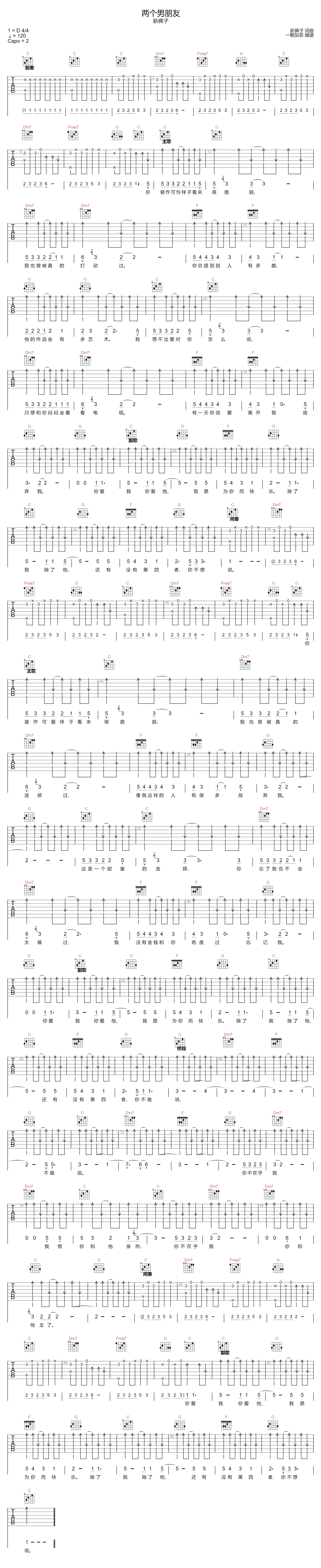 《新裤子乐队《两个男朋友吉他谱》(C调)》内容来自于互联网,不能保证内容的准确性与完整性,仅供学习交流欣赏,请勿用于其它用途,内容版权归原作者及来源网站所有,如有侵犯到您的权益请来信告知,我们将及时删除。