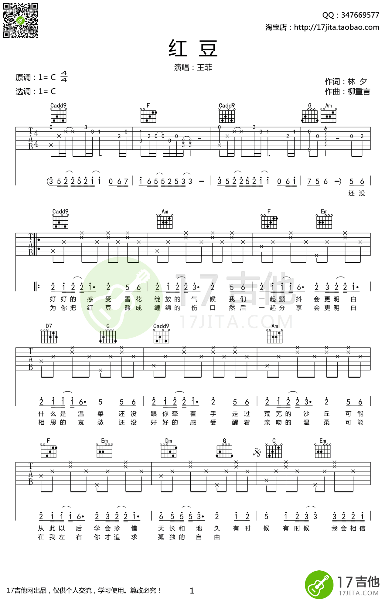 《王菲《红豆吉他谱》(C调)》内容来自于互联网,不能保证内容的准确性与完整性,仅供学习交流欣赏,请勿用于其它用途,内容版权归原作者及来源网站所有,如有侵犯到您的权益请来信告知,我们将及时删除。