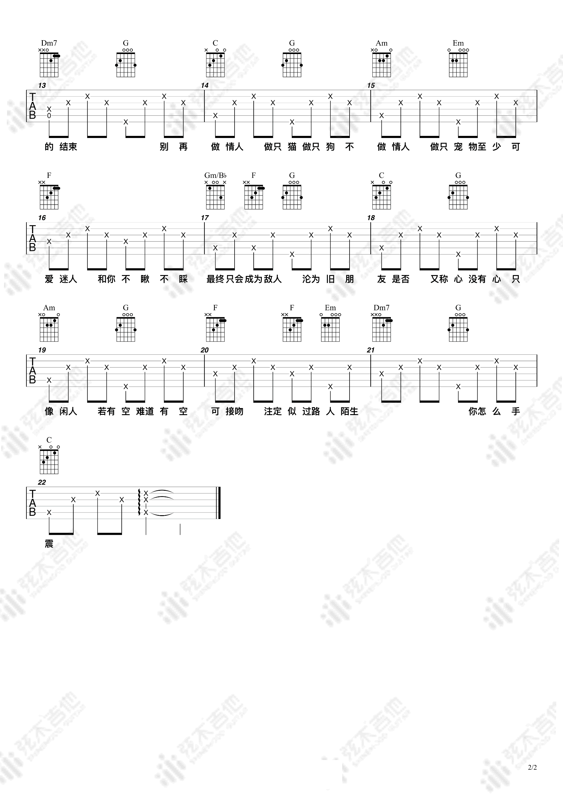 《爱与诚》吉他谱是一首粤语经典歌曲,由古巨基演唱。该曲以C调编配,配有两张高清弹唱图片谱,专为弦木吉他编配而制作。这首歌的歌词中有一句非常有吸引力的句子,即"别再做情人,做只猫做只狗不做情人",正是因为这句歌词,我深深迷恋上了《爱与诚》这首歌。这首歌充满了对感