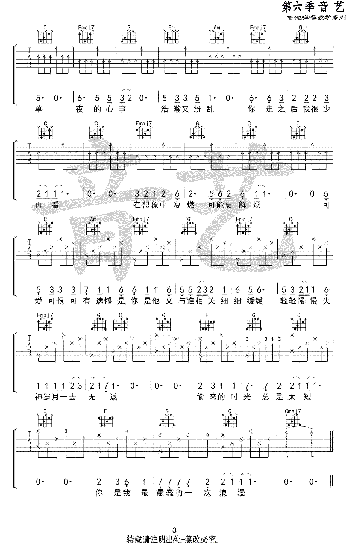 这首民谣歌曲,题为《你是我最愚蠢的一次浪漫》,由摇滚猫演唱,以C调吉他弹唱,同时提供了六线谱和高清图片谱。感谢音艺吉他的编排,并得到91吉他谱网站的推荐。摇滚猫老师在编排时进行了一些微调,使这首歌更适合个人演奏。即便不唱歌,这曲旋律也十分动听,值得一试。