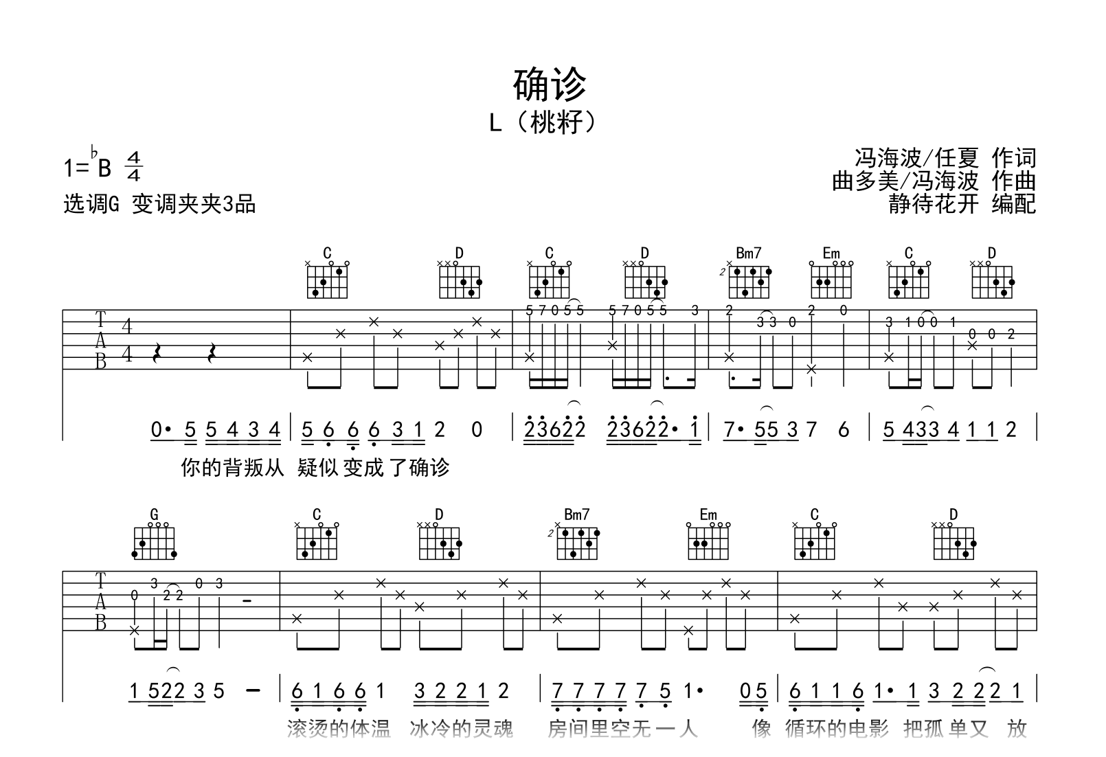 《L(桃籽)《确诊吉他谱》(G调)》内容来自于互联网,不能保证内容的准确性与完整性,仅供学习交流欣赏,请勿用于其它用途,内容版权归原作者及来源网站所有,如有侵犯到您的权益请来信告知,我们将及时删除。