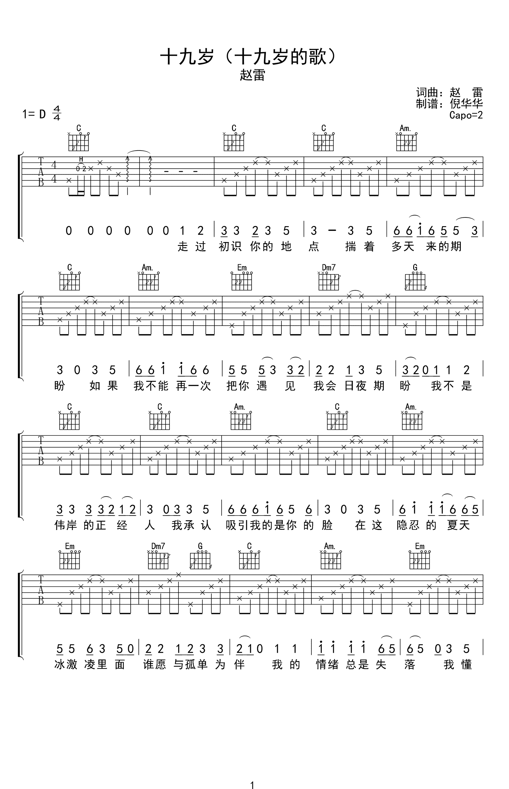 《赵雷《十九岁时候的歌吉他谱》》内容来自于互联网,不能保证内容的准确性与完整性,仅供学习交流欣赏,请勿用于其它用途,内容版权归原作者及来源网站所有,如有侵犯到您的权益请来信告知,我们将及时删除。