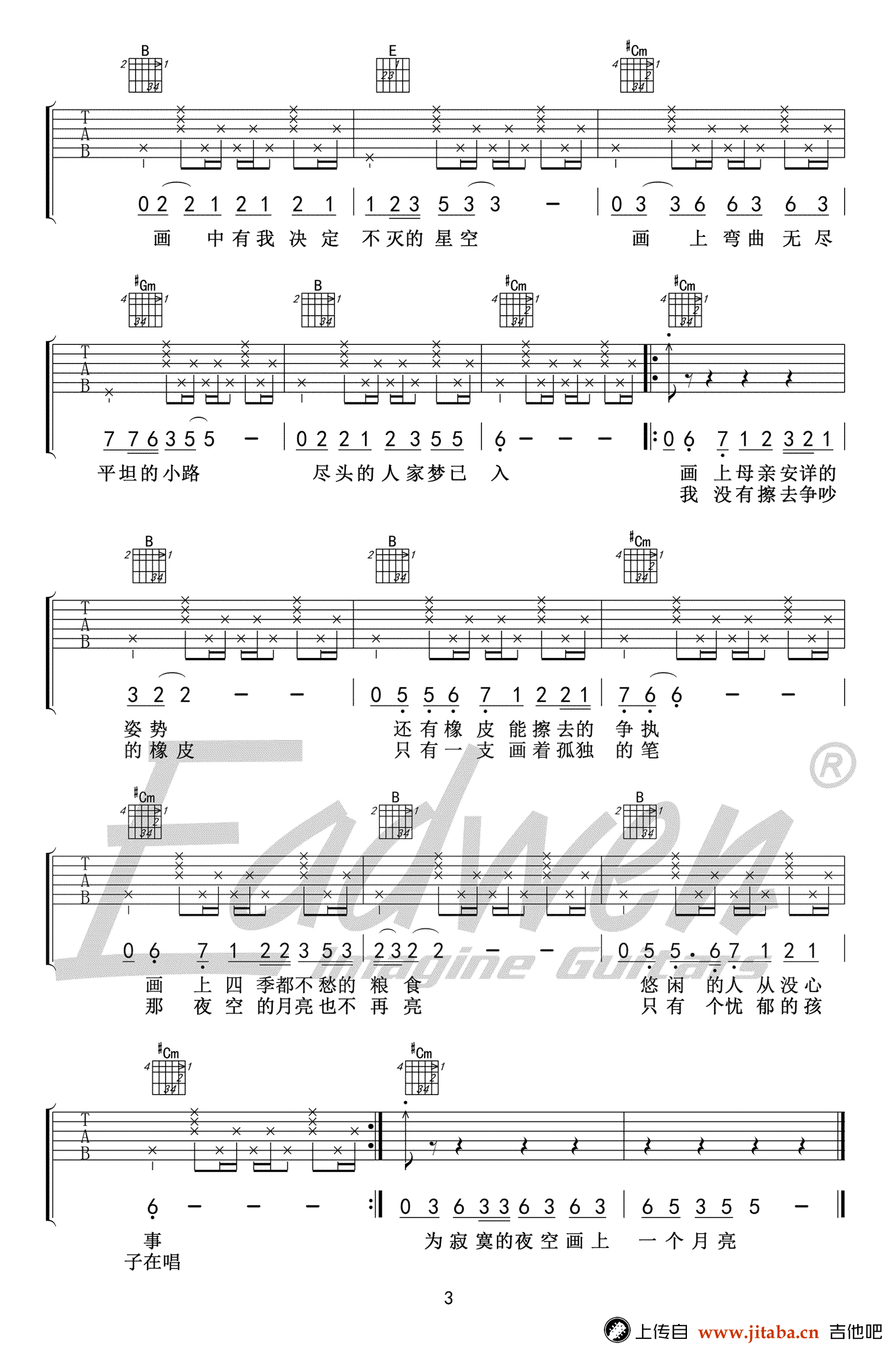 《赵雷《画吉他谱》(E调)》内容来自于互联网,不能保证内容的准确性与完整性,仅供学习交流欣赏,请勿用于其它用途,内容版权归原作者及来源网站所有,如有侵犯到您的权益请来信告知,我们将及时删除。