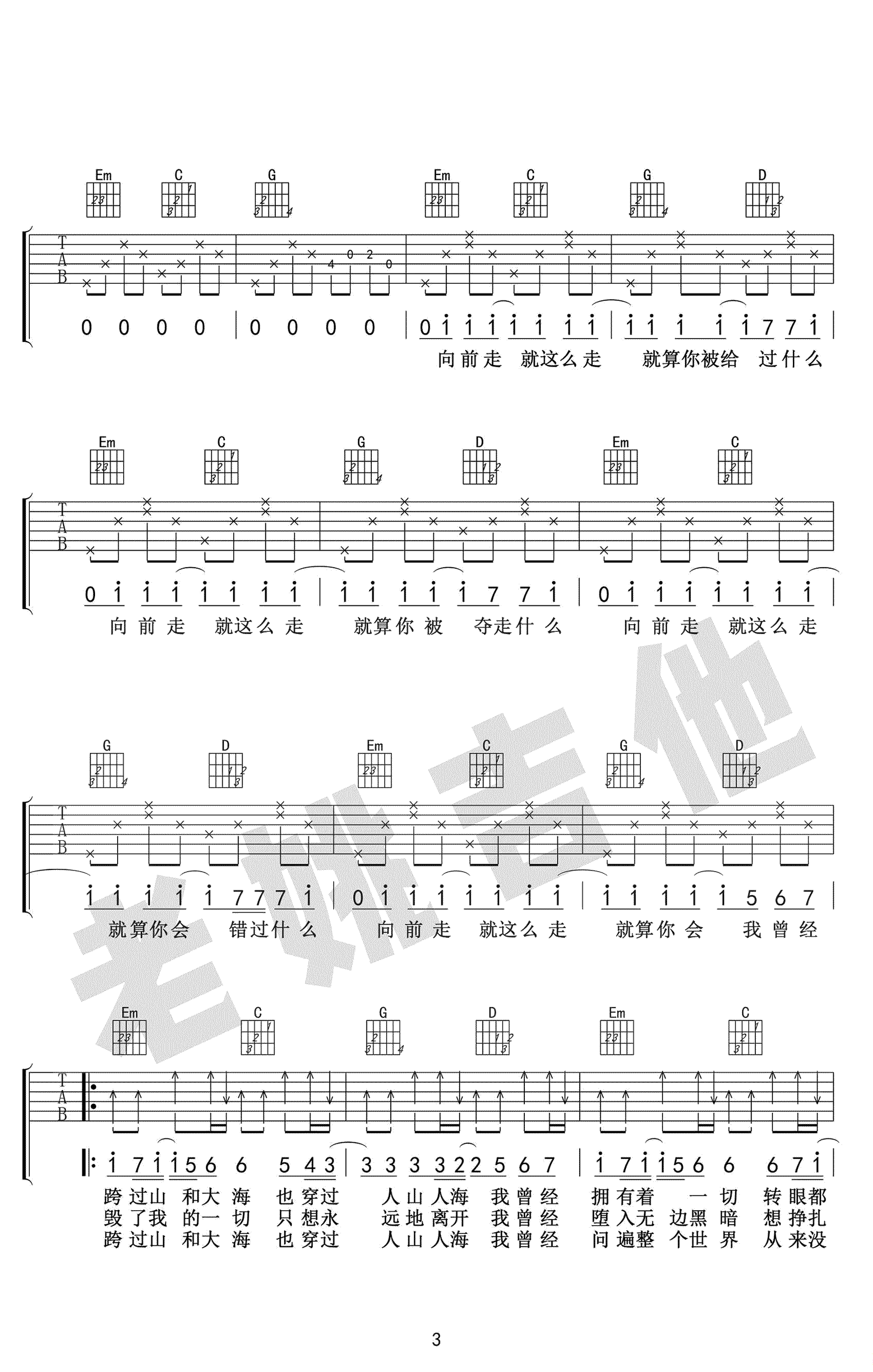 《朴树《平凡之路吉他谱》(G调)》内容来自于互联网,不能保证内容的准确性与完整性,仅供学习交流欣赏,请勿用于其它用途,内容版权归原作者及来源网站所有,如有侵犯到您的权益请来信告知,我们将及时删除。