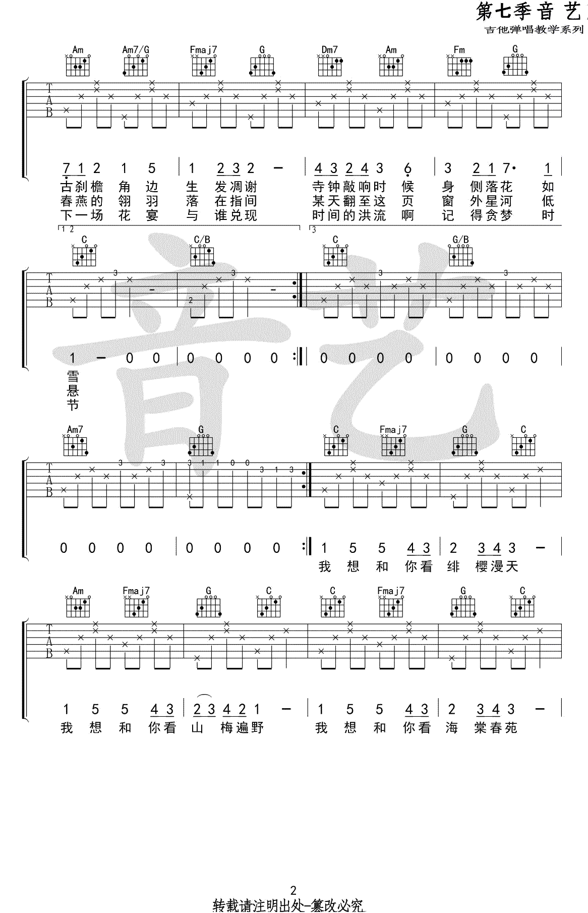 《古风歌手不才《花枝春野吉他谱》(C调)》内容来自于互联网,不能保证内容的准确性与完整性,仅供学习交流欣赏,请勿用于其它用途,内容版权归原作者及来源网站所有,如有侵犯到您的权益请来信告知,我们将及时删除。