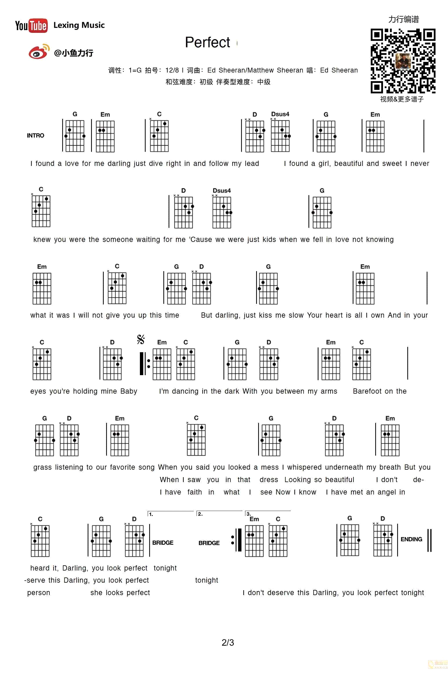 这是一首经典英文歌曲《Perfect》,由艾德·希兰演唱,提供了G调吉他弹唱谱,和弦伴奏图片谱高清版,由力行音乐制作。这首歌温馨浪漫,完美呈现了爱情童话,充满感动。与谱附带有吉他弹唱演示视频,琴友们可以通过练习来欣赏和演奏这首让人陷入爱河的情歌。
