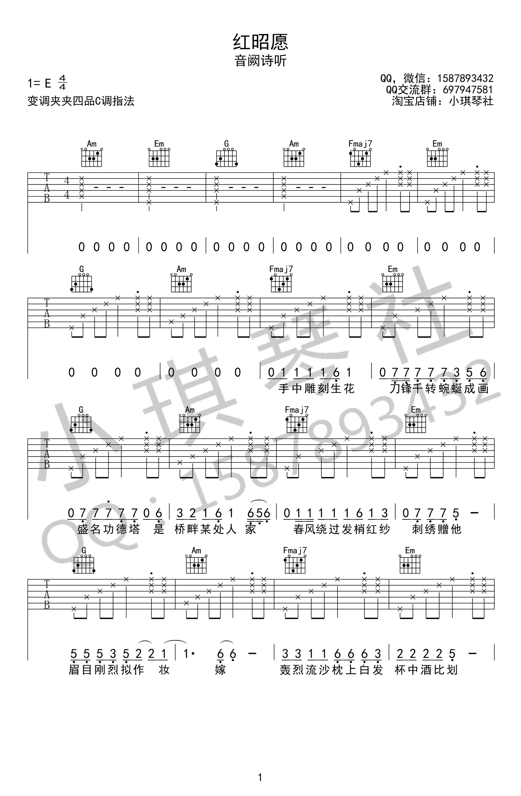 《小琪《红昭愿吉他谱》(C调)》内容来自于互联网,不能保证内容的准确性与完整性,仅供学习交流欣赏,请勿用于其它用途,内容版权归原作者及来源网站所有,如有侵犯到您的权益请来信告知,我们将及时删除。