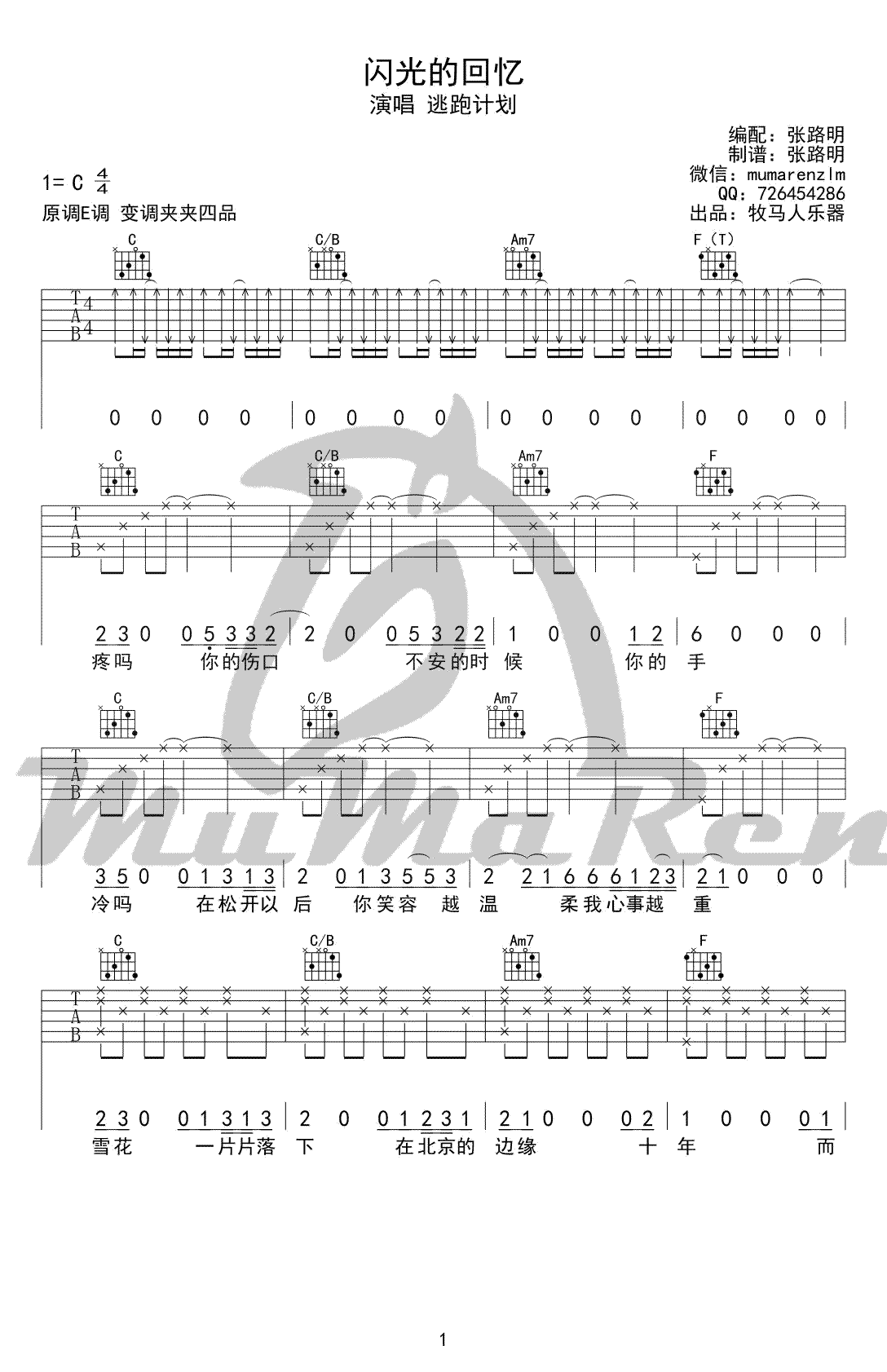这是一首逃跑计划的吉他曲,《闪光的回忆》。曲谱采用C调指法编配,六线谱,使用变调夹夹四品。完整版本包含五张图片谱例,由牧马人乐器制作。这首歌的旋律清澈悠扬,如同回忆里最柔软的部分。多年后,回忆的细节渐渐褪色,但其中的情感却依然熠熠闪光。感谢张路明老师为琴友们带