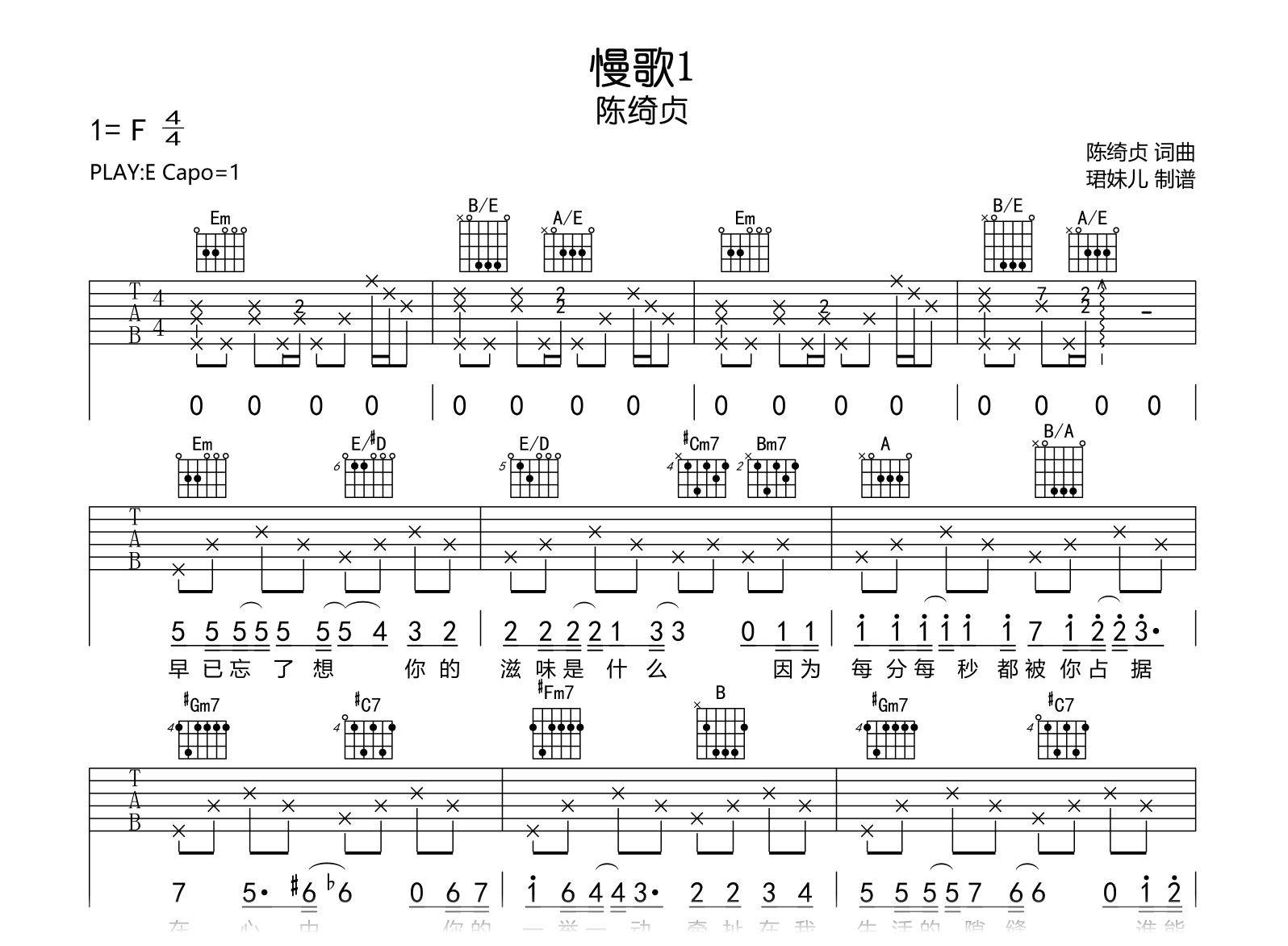 《陈绮贞《慢歌1吉他谱》(E调)》内容来自于互联网,不能保证内容的准确性与完整性,仅供学习交流欣赏,请勿用于其它用途,内容版权归原作者及来源网站所有,如有侵犯到您的权益请来信告知,我们将及时删除。