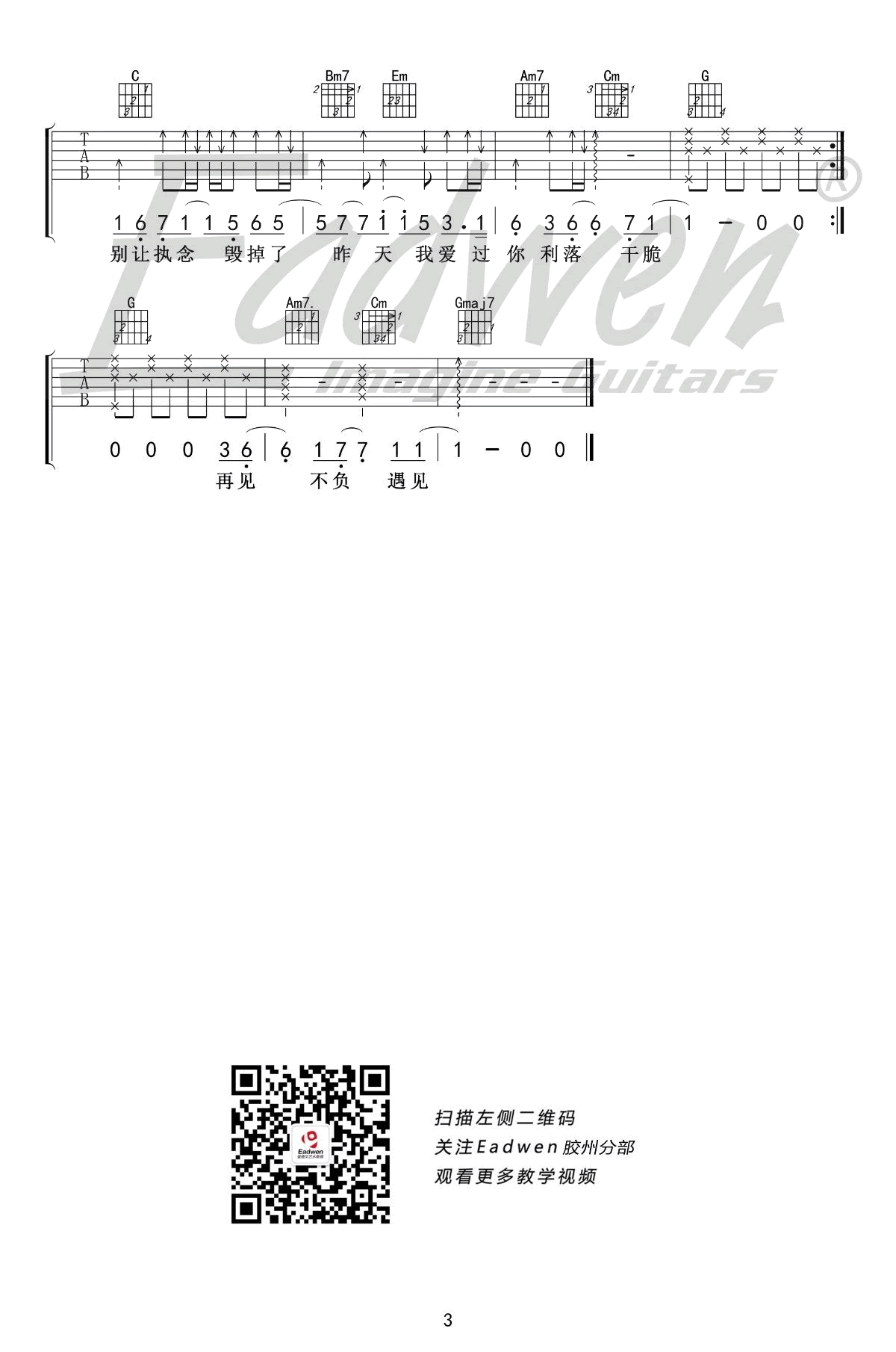 这是一首吉他谱,为于文文的《体面》,原调是bB,但现在变调到G,并夹第三品。这首歌是电影《前任三》中的插曲,以六线谱的形式呈现,并提供了高清图片谱。附带一位名叫吴老师的教学视频,可以帮助你学会吉他弹唱这首歌。这份资源由爱德文吉他教室制作,感谢91吉他谱网站的分