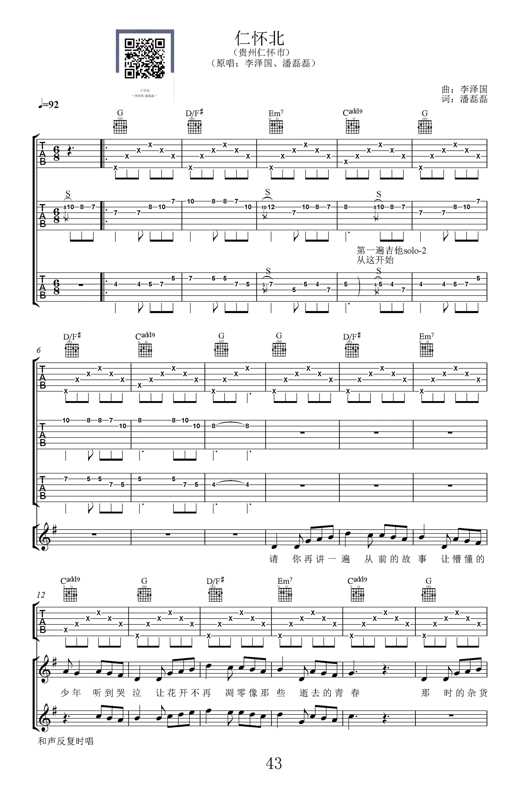 《李泽国和潘磊磊《仁怀北吉他谱》》内容来自于互联网,不能保证内容的准确性与完整性,仅供学习交流欣赏,请勿用于其它用途,内容版权归原作者及来源网站所有,如有侵犯到您的权益请来信告知,我们将及时删除。