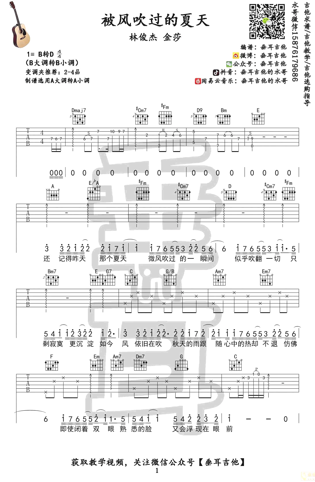 这是一首由林俊杰和金莎演唱的男女对唱经典情歌,《被风吹过的夏天》的吉他曲谱。曲谱采用B转D调,建议使用2-4品变调夹演奏。制谱选择A大调转A小调,提供了六线谱和三张吉他弹唱图片谱。感谢垂耳吉他编配,还附带了吉他弹唱教学视频。这首歌曲勾勒出一段懵懂青涩的情感回忆