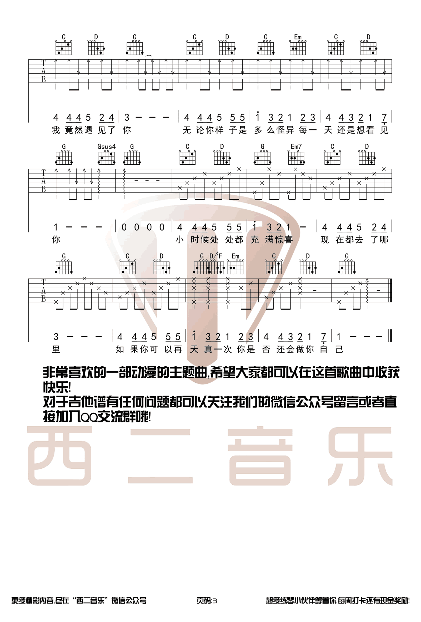 这是一首治愈系吉他曲《无论你多怪异我还是会喜欢你》,是动画片《刺客五六七》片尾曲。曲谱采用G调指法编配,由西二吉他制作,提供了三张高清图片谱。这首歌旋律优美,节奏轻快,给人一种温暖和宽慰的感觉。与动画片的风格相契合,展现了温柔搞笑的特色。无论多么怪异,歌曲传达