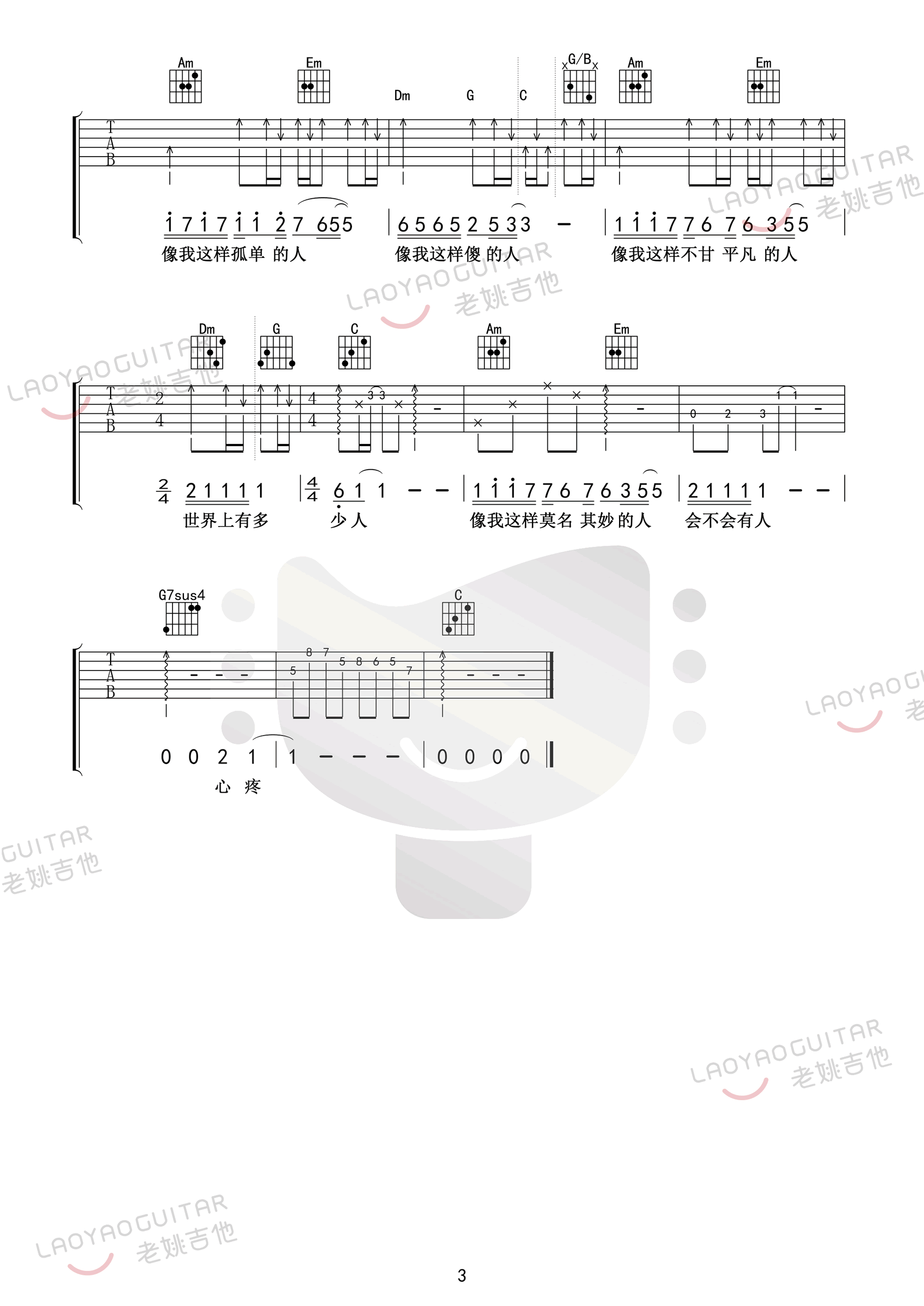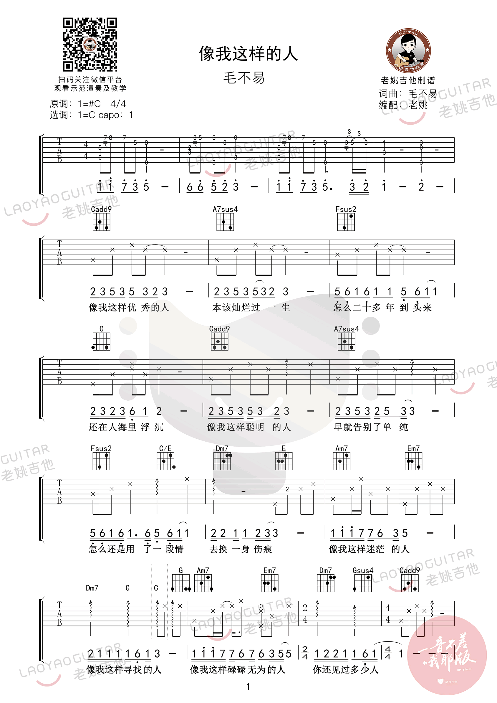 《像我这样的人》吉他谱三张,是毛不易的经典代表作之一。采用C调指法编配,配以一品协弦夹,特别感谢吉他编曲大师老姚的精心制作。这份谱子完美还原了毛不易录音版的原声,包括前奏和间奏的指弹。喜欢这首歌的吉他爱好者们一定不能错过,快跟随教学视频一起练习吧!此外,附带一
