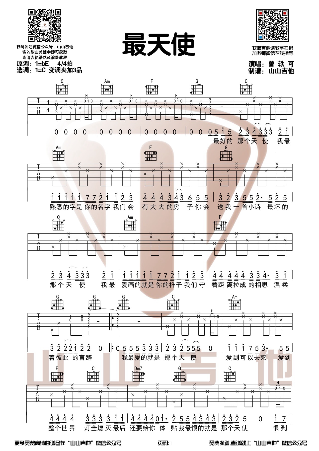 《曾轶可《最天使吉他谱》(C调)》内容来自于互联网,不能保证内容的准确性与完整性,仅供学习交流欣赏,请勿用于其它用途,内容版权归原作者及来源网站所有,如有侵犯到您的权益请来信告知,我们将及时删除。