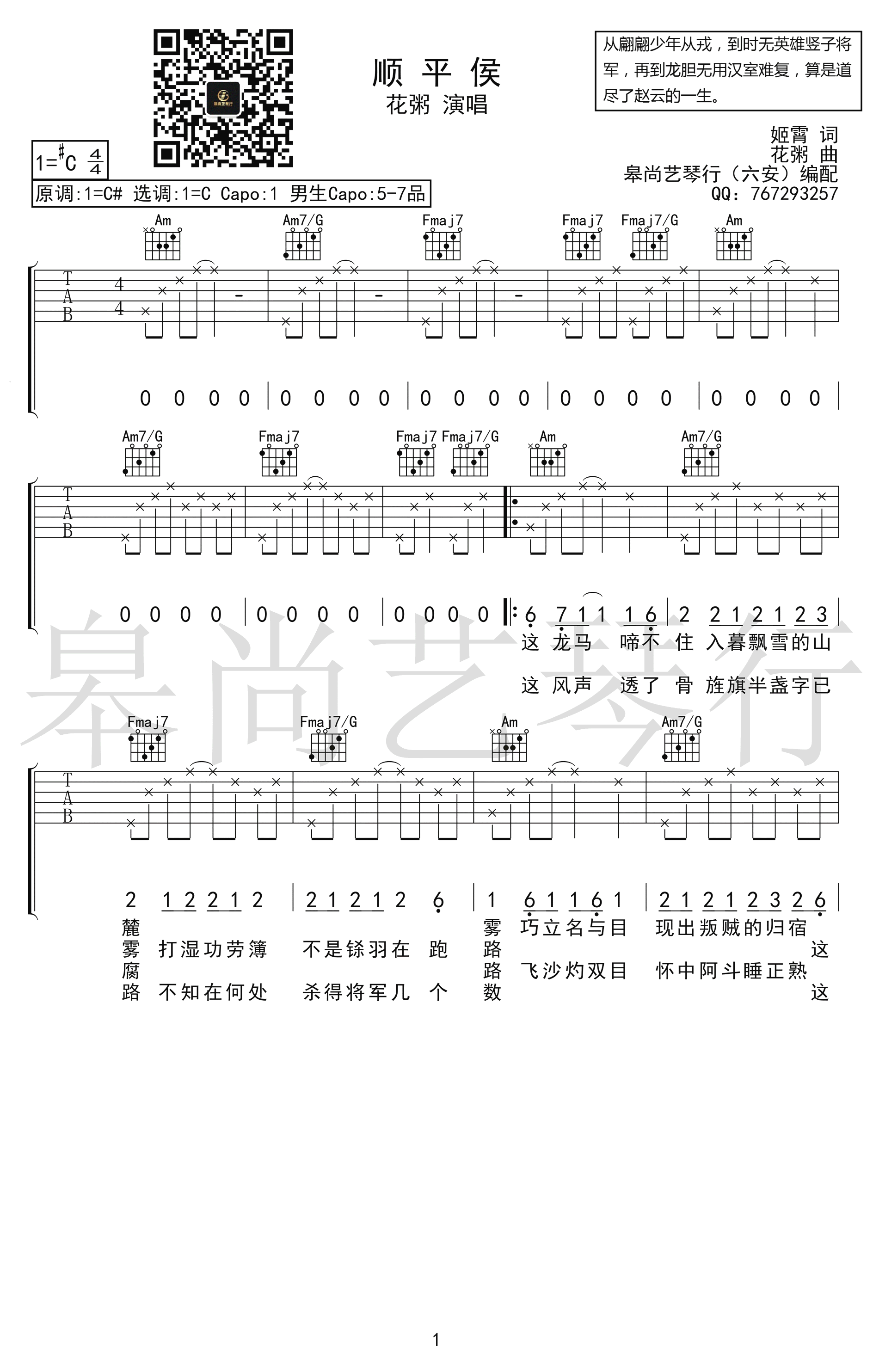 《花粥《顺平侯吉他谱》(C调)》内容来自于互联网,不能保证内容的准确性与完整性,仅供学习交流欣赏,请勿用于其它用途,内容版权归原作者及来源网站所有,如有侵犯到您的权益请来信告知,我们将及时删除。