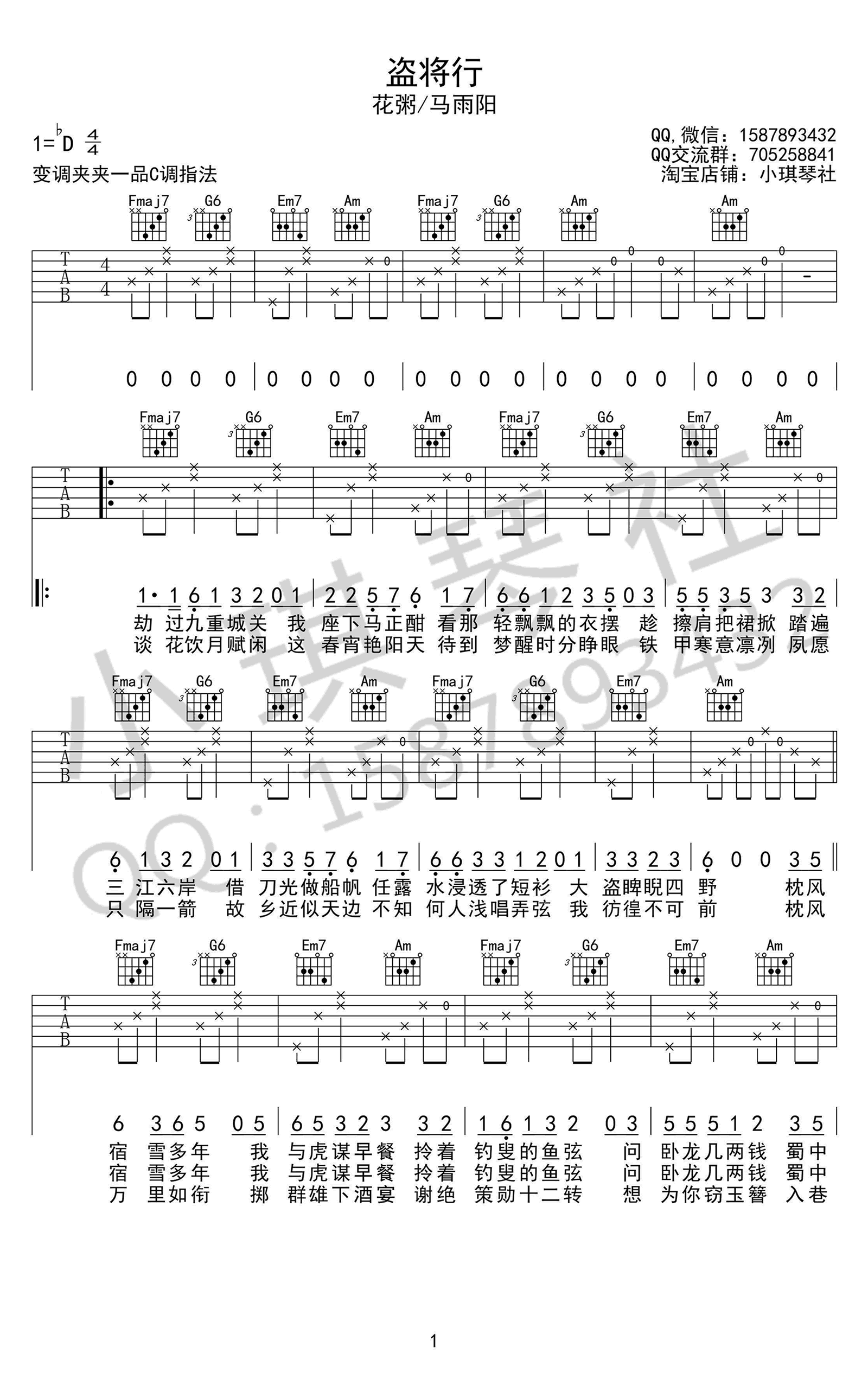 这是一首由花粥和马雨阳演唱的热门民谣歌曲《盗将行》的吉他谱。谱子采用C调指法编配,原调为降D,使用了变调夹。这份由小琪琴社制作的高清图片弹唱谱受到了广泛的上传和分享。这首歌曲不仅仅是古风韵调的展现,更是一个凄美感人的爱情故事,深深打动着听众,让人陶醉其中,常常