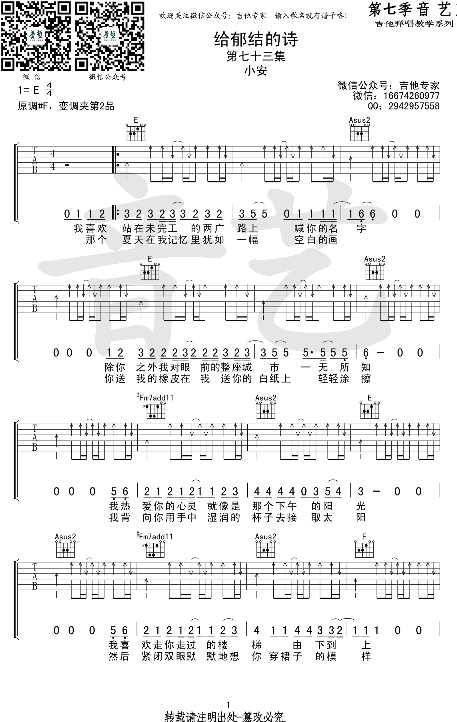 《小安《给郁结的诗吉他谱》(E调)》内容来自于互联网,不能保证内容的准确性与完整性,仅供学习交流欣赏,请勿用于其它用途,内容版权归原作者及来源网站所有,如有侵犯到您的权益请来信告知,我们将及时删除。
