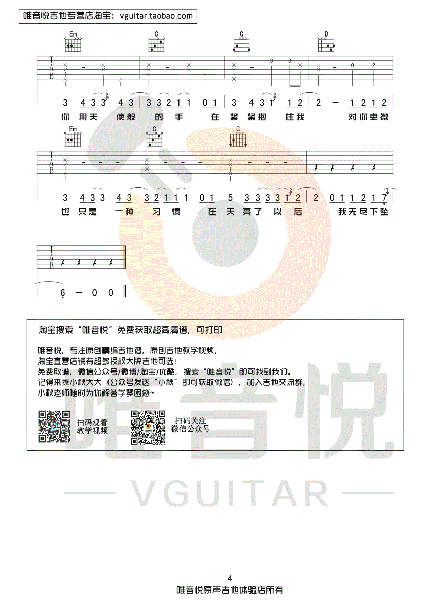 "下坠falling"是一首抖音热门歌曲,由CORKI演唱。这首歌的吉他谱采用了G调指法,原调是bA,需要使用变调夹夹在一品位。谱中包括了四张图片,感谢唯音悦编配制作并分享于91吉他谱网站。歌曲结构相对简单,循环进行Em、C、G、D和弦的变化。主歌和副歌部分的
