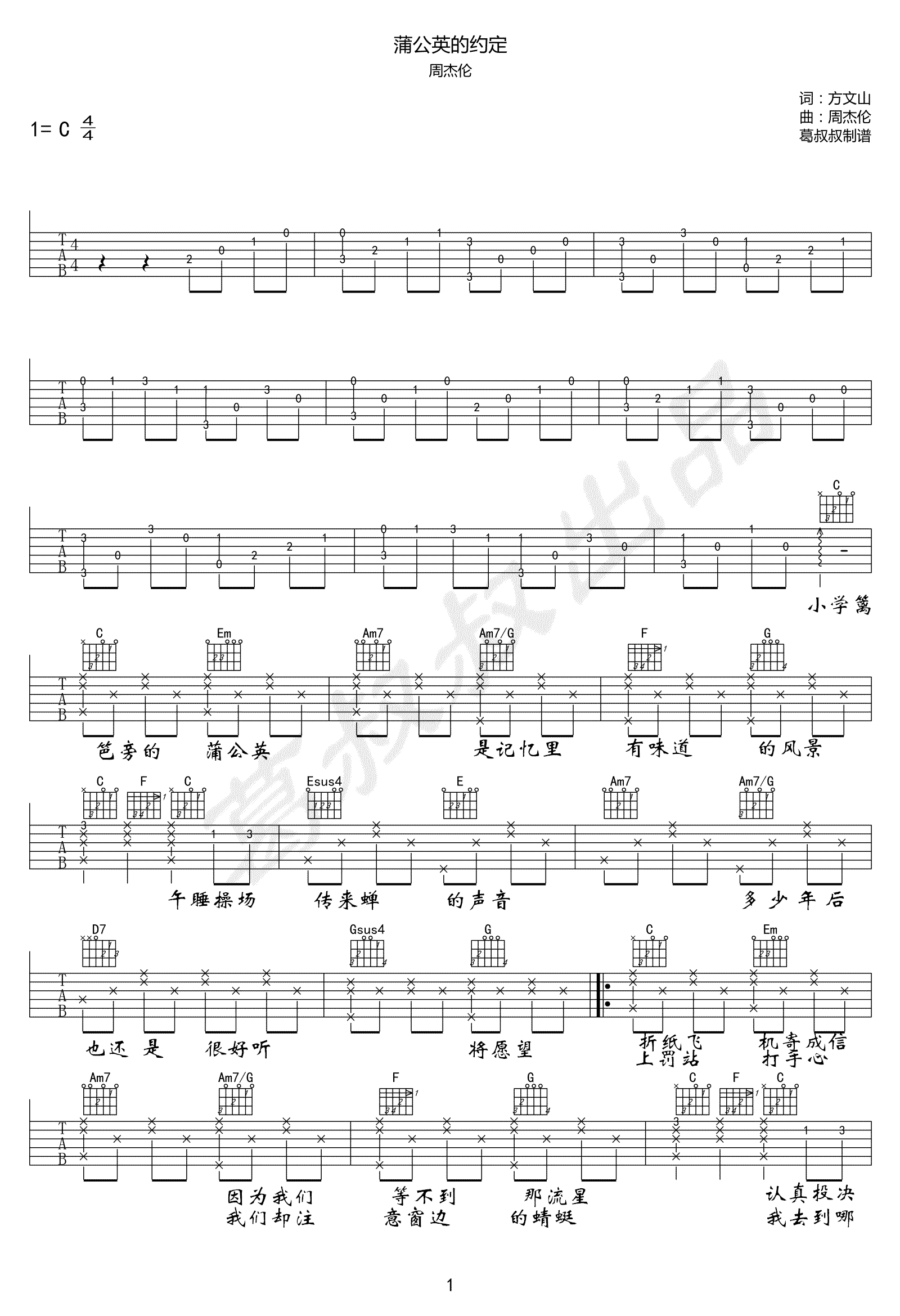 《周杰伦《蒲公英的约定吉他谱》(C调)》内容来自于互联网,不能保证内容的准确性与完整性,仅供学习交流欣赏,请勿用于其它用途,内容版权归原作者及来源网站所有,如有侵犯到您的权益请来信告知,我们将及时删除。