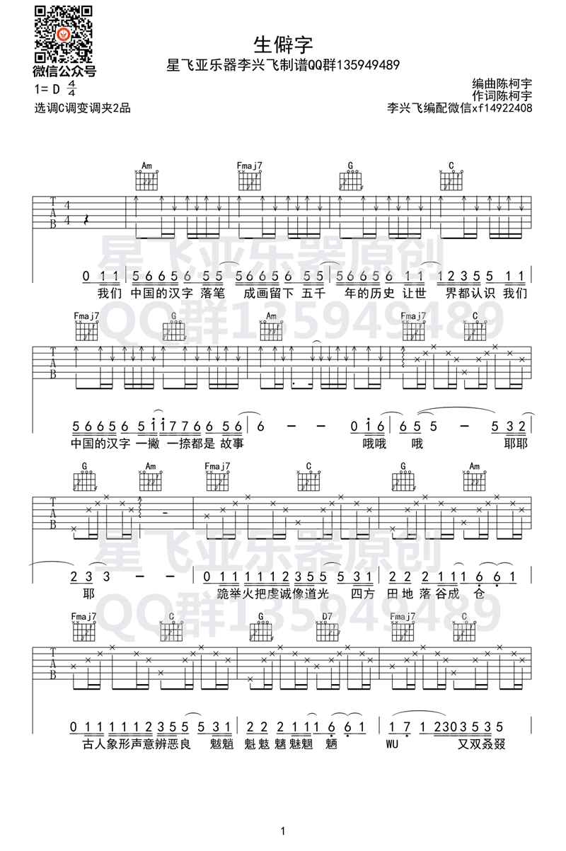《陈柯宇《生僻字吉他谱》(C调)》内容来自于互联网,不能保证内容的准确性与完整性,仅供学习交流欣赏,请勿用于其它用途,内容版权归原作者及来源网站所有,如有侵犯到您的权益请来信告知,我们将及时删除。