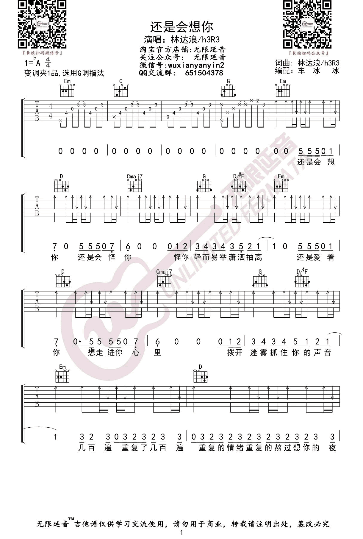 《林达浪《还是会想你吉他谱》(G调)》内容来自于互联网,不能保证内容的准确性与完整性,仅供学习交流欣赏,请勿用于其它用途,内容版权归原作者及来源网站所有,如有侵犯到您的权益请来信告知,我们将及时删除。