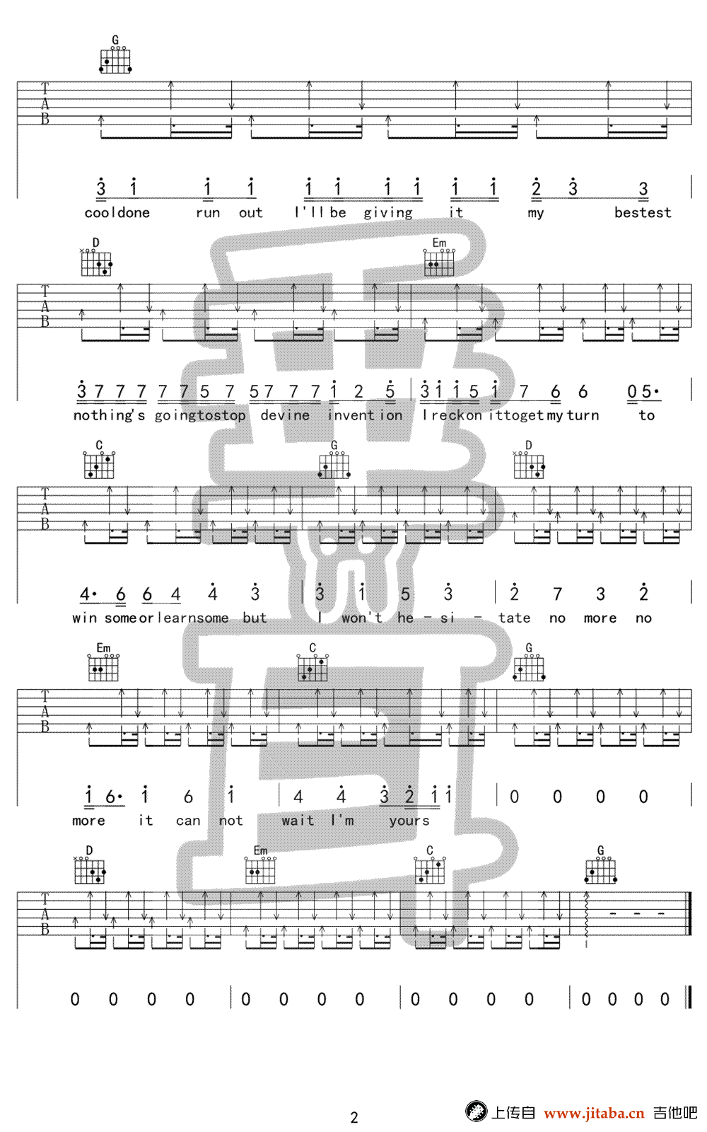 《Jason Mraz《I'm yours吉他谱》(G调)》内容来自于互联网,不能保证内容的准确性与完整性,仅供学习交流欣赏,请勿用于其它用途,内容版权归原作者及来源网站所有,如有侵犯到您的权益请来信告知,我们将及时删除。