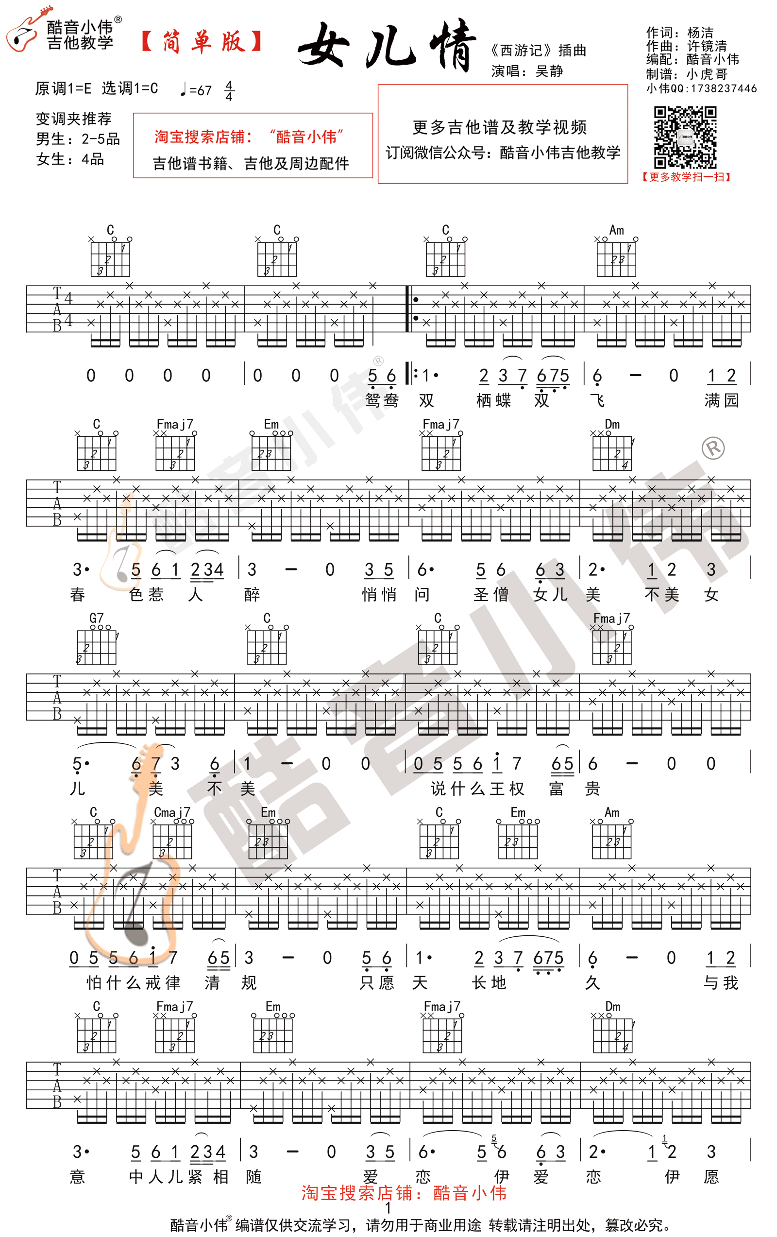 这是一首简单版的女儿情吉他曲谱,以C调为基础,易于学习。这首歌曲如同岁月的流淌,是老歌中的一首经典之作,曾出现在电视剧《西游记之女儿国》中。它的六线谱采用了原调E,同时提供了适合男生使用2-5品和女生使用4品的变调夹。这个版本由酷音小伟精心编排,成品质量非常高