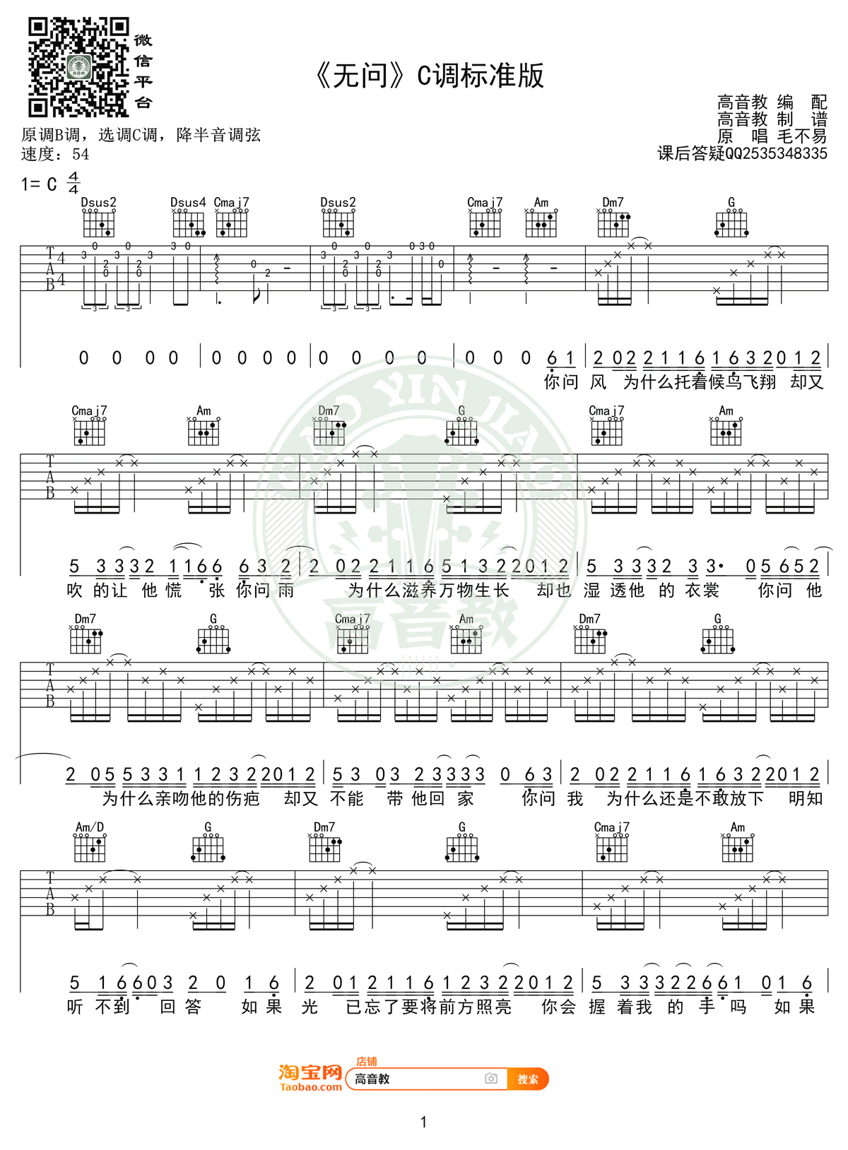 《毛不易《无问吉他谱》(C调)》内容来自于互联网,不能保证内容的准确性与完整性,仅供学习交流欣赏,请勿用于其它用途,内容版权归原作者及来源网站所有,如有侵犯到您的权益请来信告知,我们将及时删除。