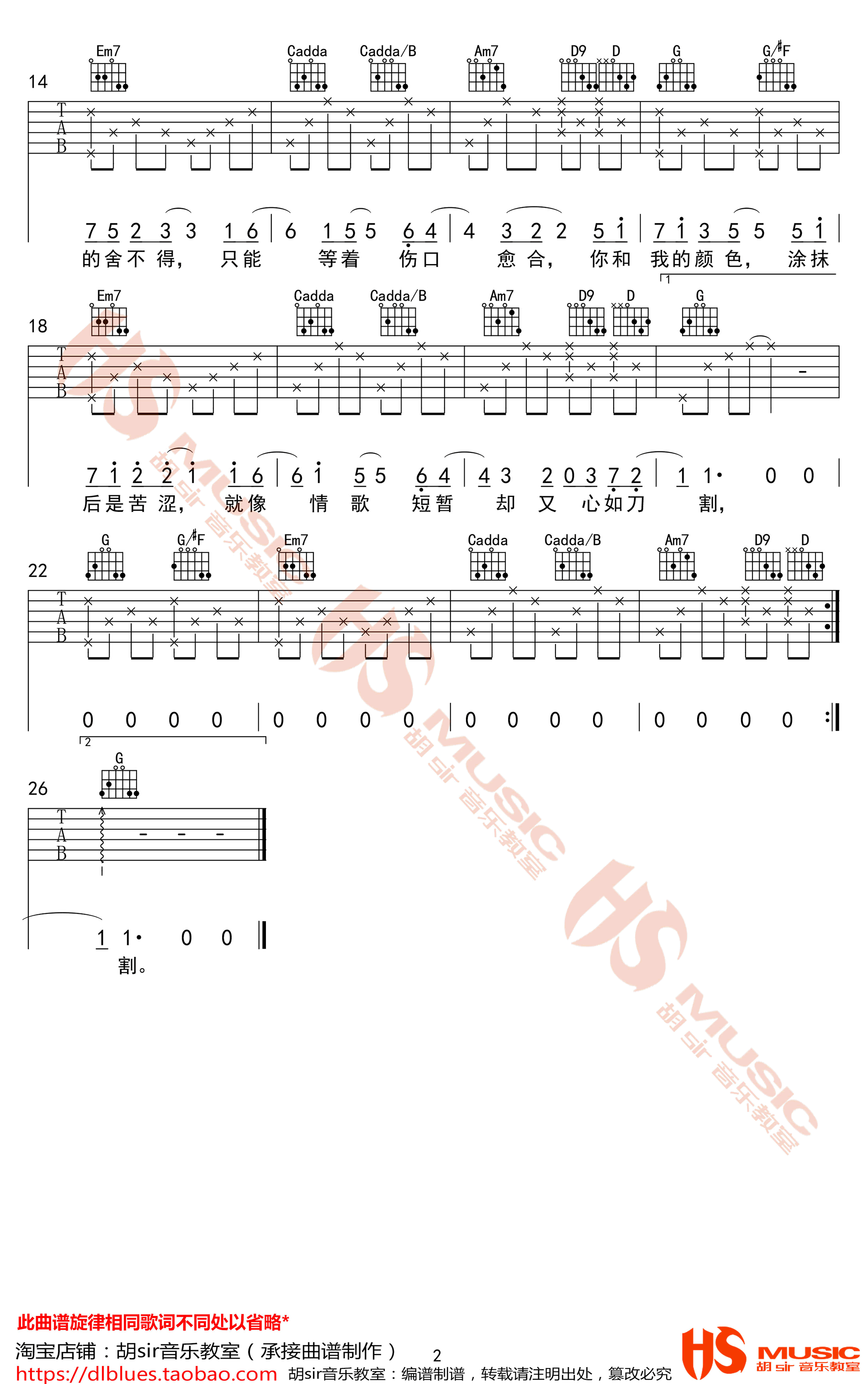 这首歌曲是《窗外的颜色》,由Gifty演唱,吉他演奏使用G调指法,并使用变调夹夹在一品位。你可以在高清弹唱图片谱中找到吉他的六线谱。这份谱子由胡Sir音乐教室制作,被91吉他谱网站推荐分享。这首歌曲的曲谱可帮助吉他手们演奏这首美妙的音乐。