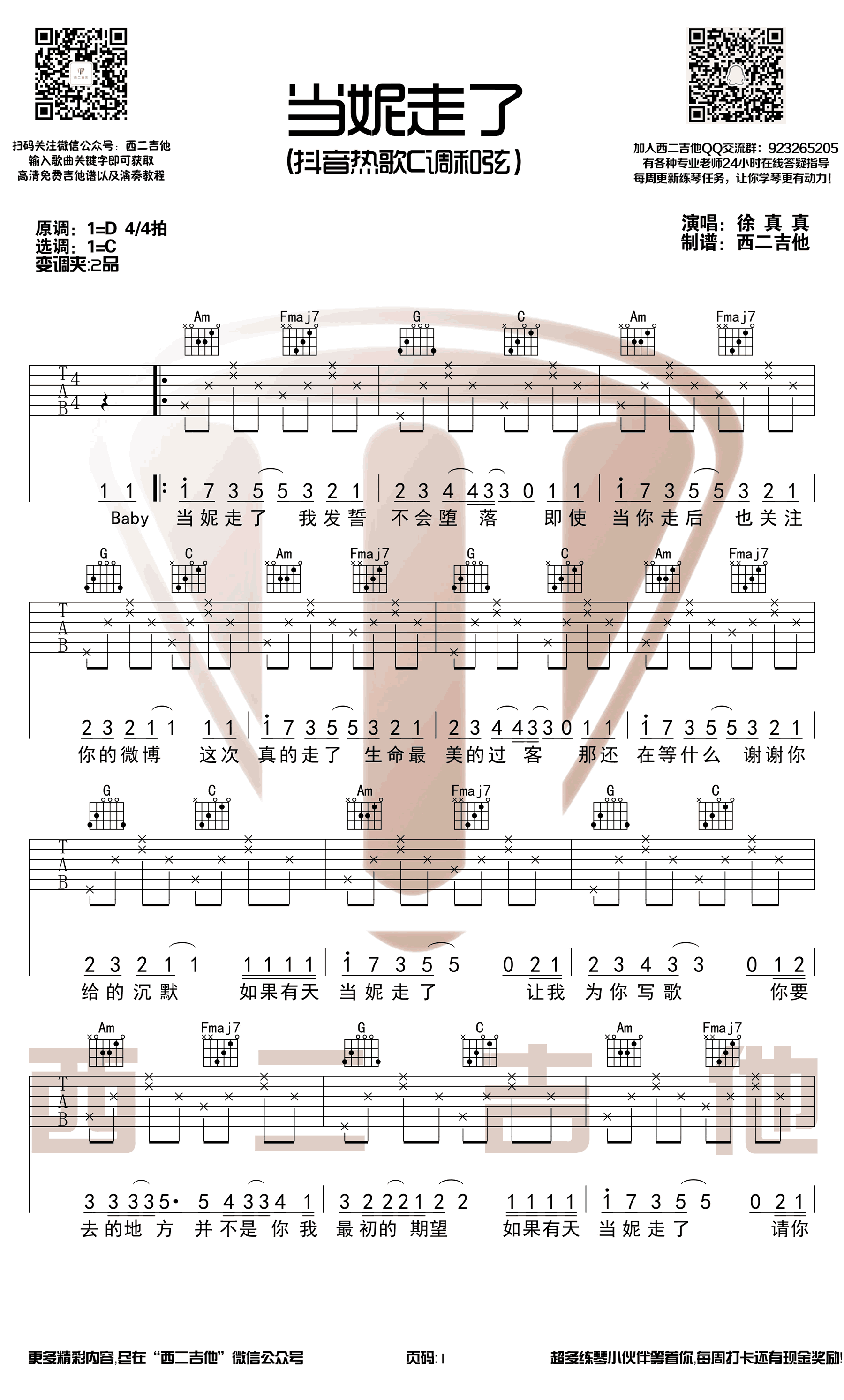 《西二《当妮走了吉他谱》(C调)》内容来自于互联网,不能保证内容的准确性与完整性,仅供学习交流欣赏,请勿用于其它用途,内容版权归原作者及来源网站所有,如有侵犯到您的权益请来信告知,我们将及时删除。