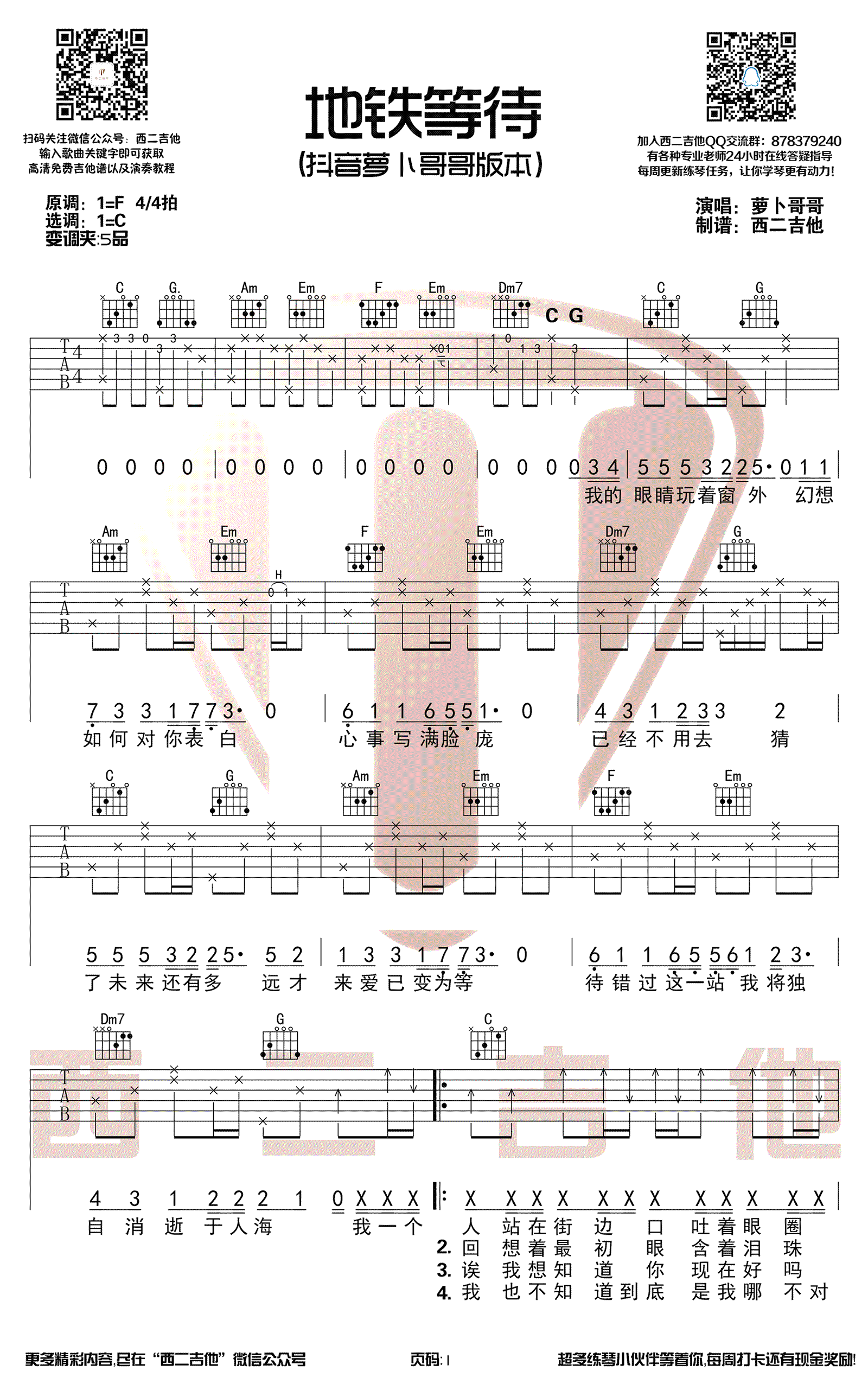 《西二《地铁等待吉他谱》(C调)》内容来自于互联网,不能保证内容的准确性与完整性,仅供学习交流欣赏,请勿用于其它用途,内容版权归原作者及来源网站所有,如有侵犯到您的权益请来信告知,我们将及时删除。
